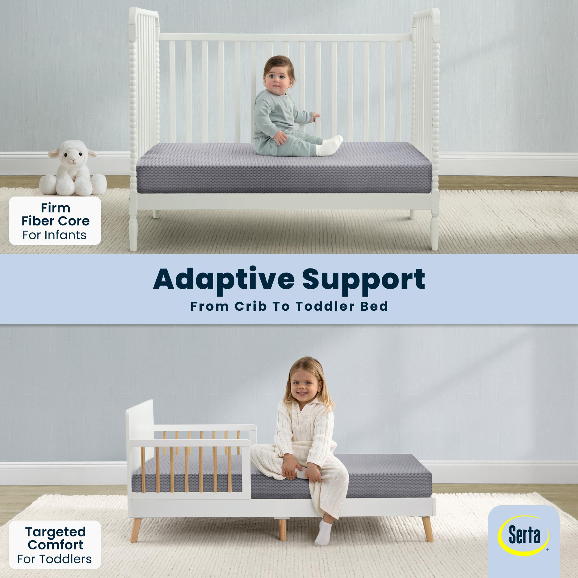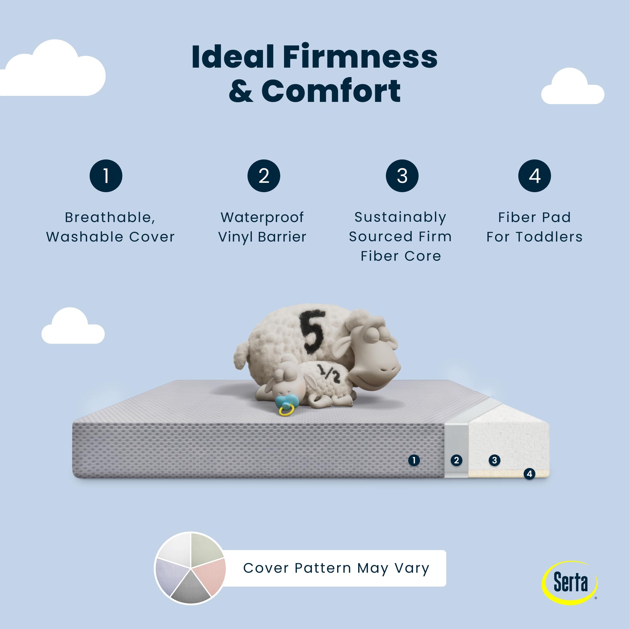 TWO-STAGE DESIGN: Infant side features a firm sleep surface that is ideal for babies | Toddler side features an additional fiber pad layer for comfort as your child grows | Pattern on mattress cover may vary