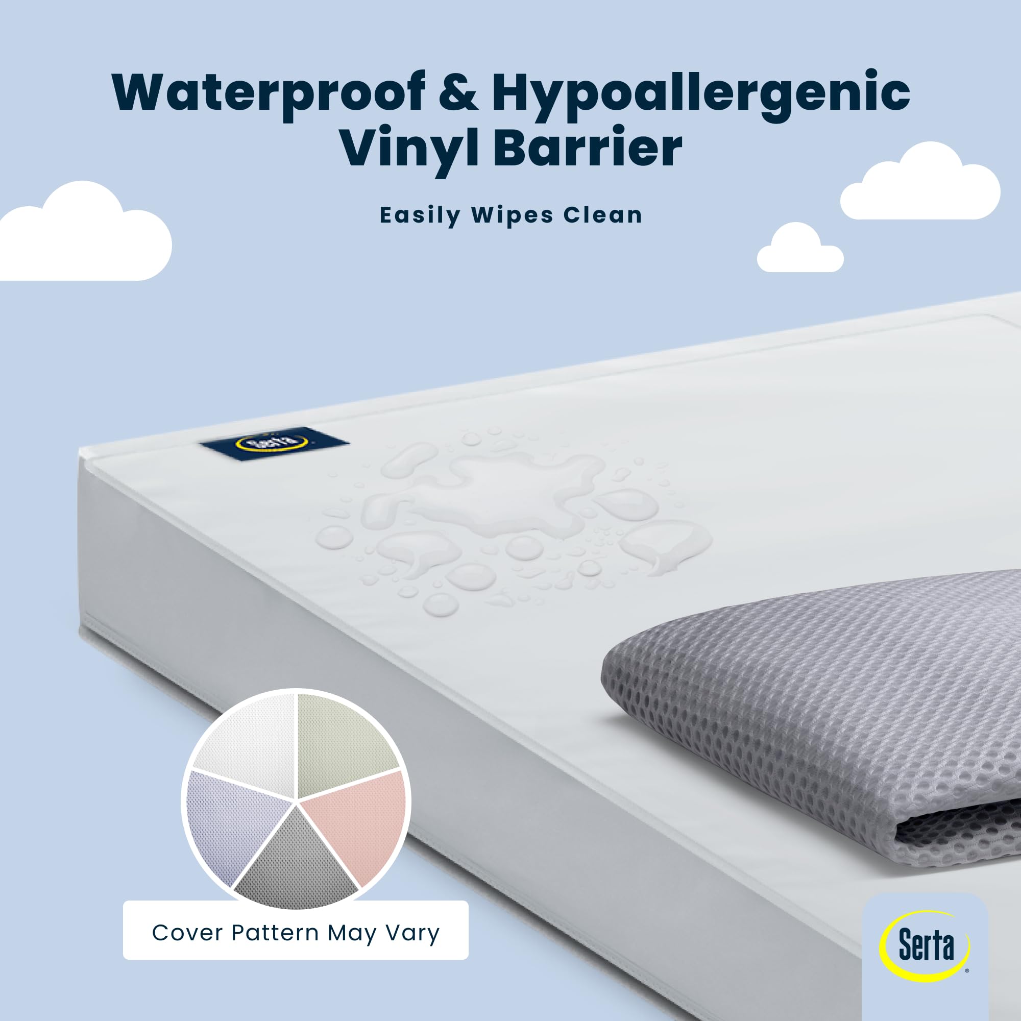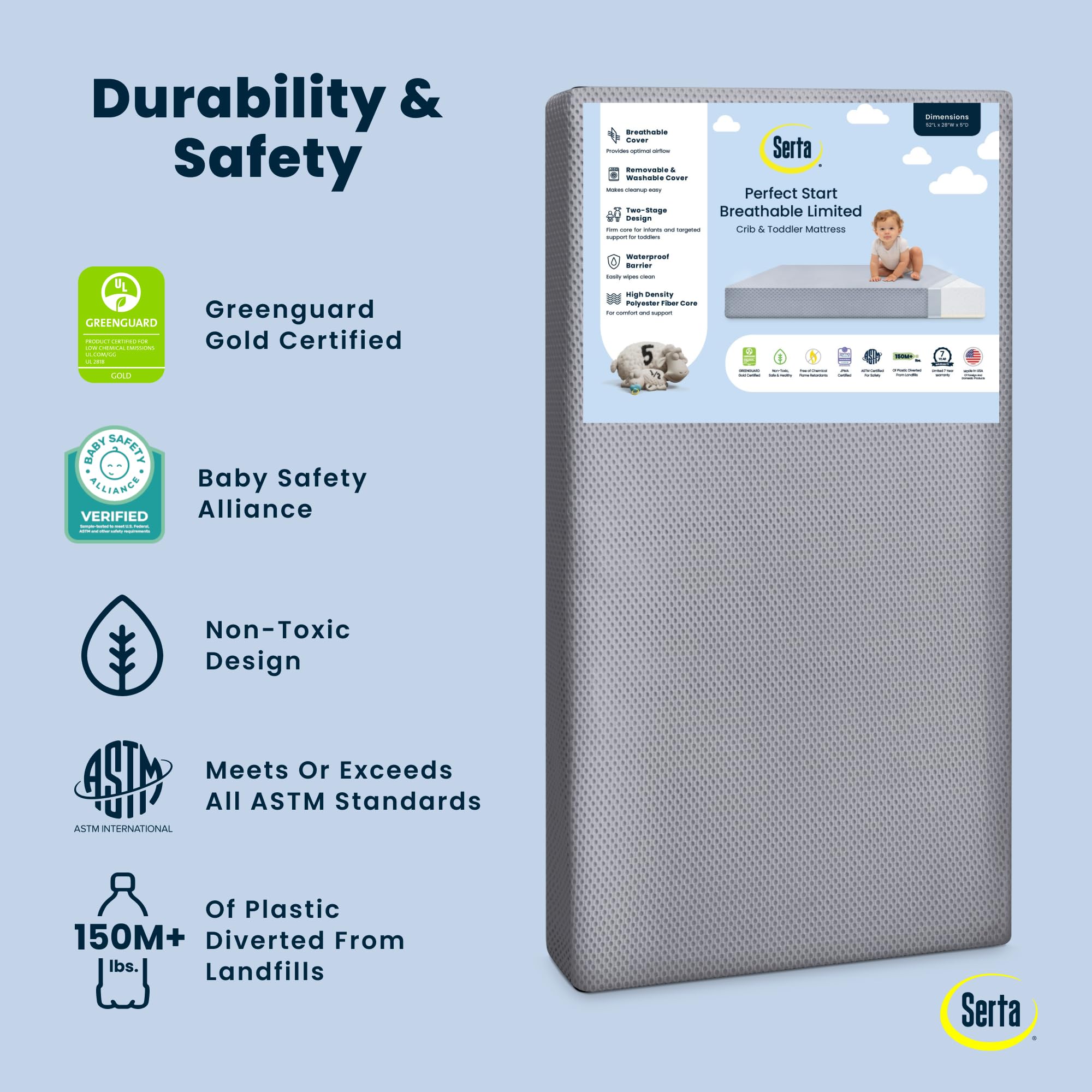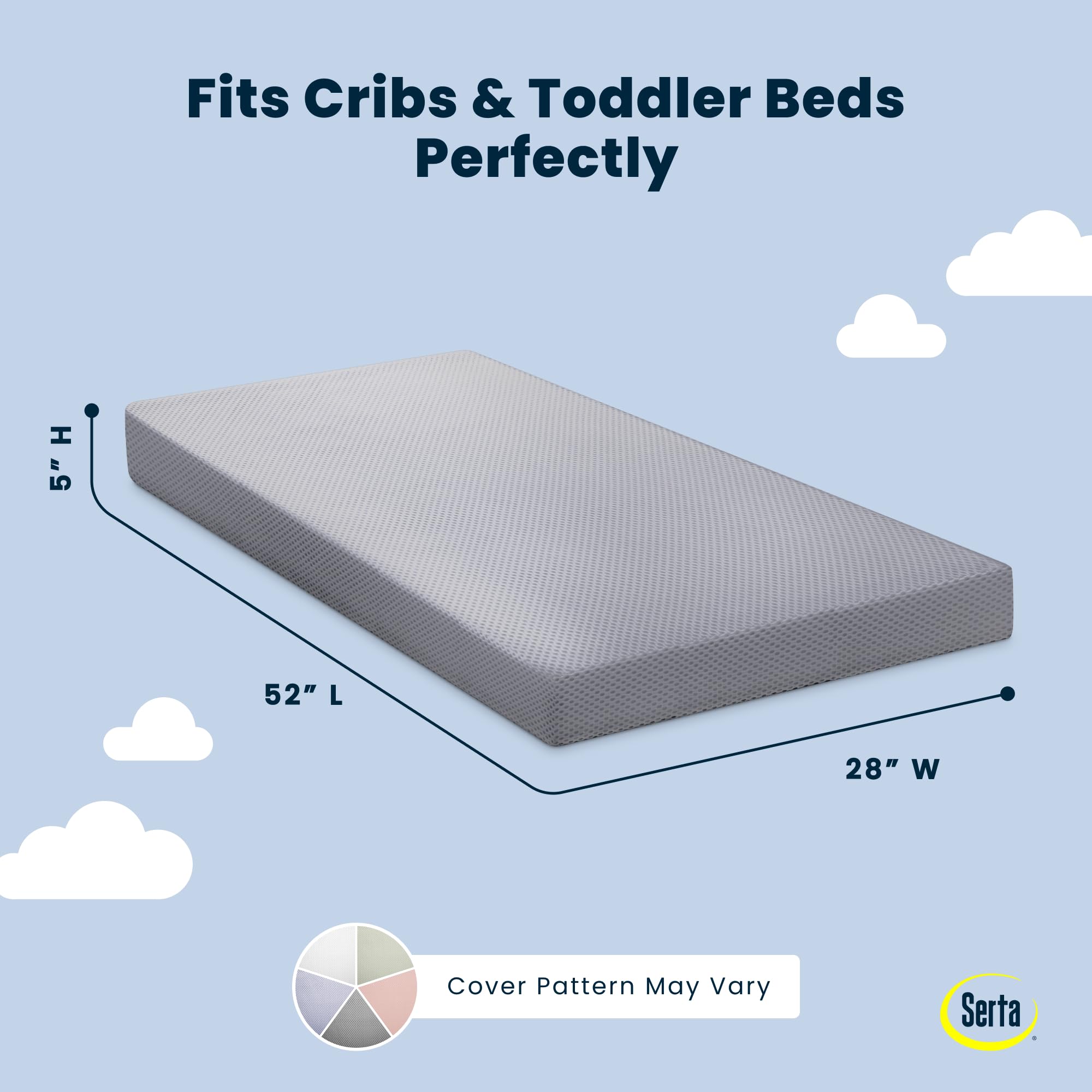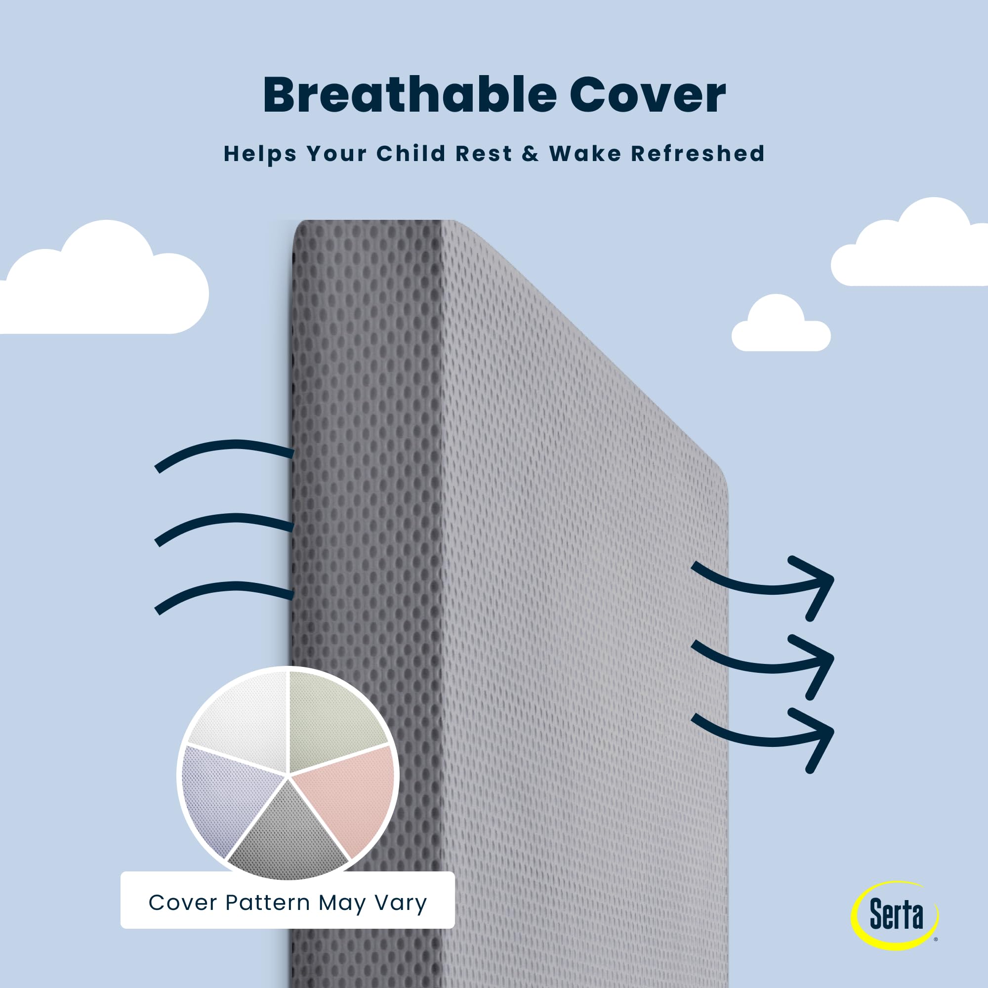Achieve a safer, longer, happier sleep for your baby (and you!) with Serta Perfect Start Breathable Limited Two -Stage Crib Mattress and Toddler Mattress. Topped with a breathable cover, the three-dimensional mesh fabric allows air to flow through the cover fabric and under baby, promoting continuous airflow and helping regulate baby’s temperature for a comfortable sleeping environment. For easy cleanup, the fully removable cover is machine washable while the waterproof and hypoallergenic mattress encasement wipes clean. At its core, this mattress features a fiber construction made from recycled bottles that delivers the ideal firmness level for newborns, infants and toddlers while helping save over 300 bottles from the landfill--great for babies, great for the environment. Built to effortlessly grow with your child, this mattress features two distinct sides, the infant side features a firm sleep surface that is ideal for babies, while the toddler side features an additional fiber pad layer for comfort as your child grows. Get the Serta Perfect Start Breathable Limited Two -Stage Crib Mattress and Toddler Mattress for your little one and breathe easy every night. Patterns on mattress cover may vary. This crib mattress is GREENGUARD Gold certified. Tested to meet or exceed the most stringent chemical emissions standards to create a healthier home for your baby, it has been screened for more than 10,000 chemicals and VOCs that are known to pollute indoor air. Certified to contribute to cleaner indoor air, you can feel good about putting this mattress in your child’s nursery.