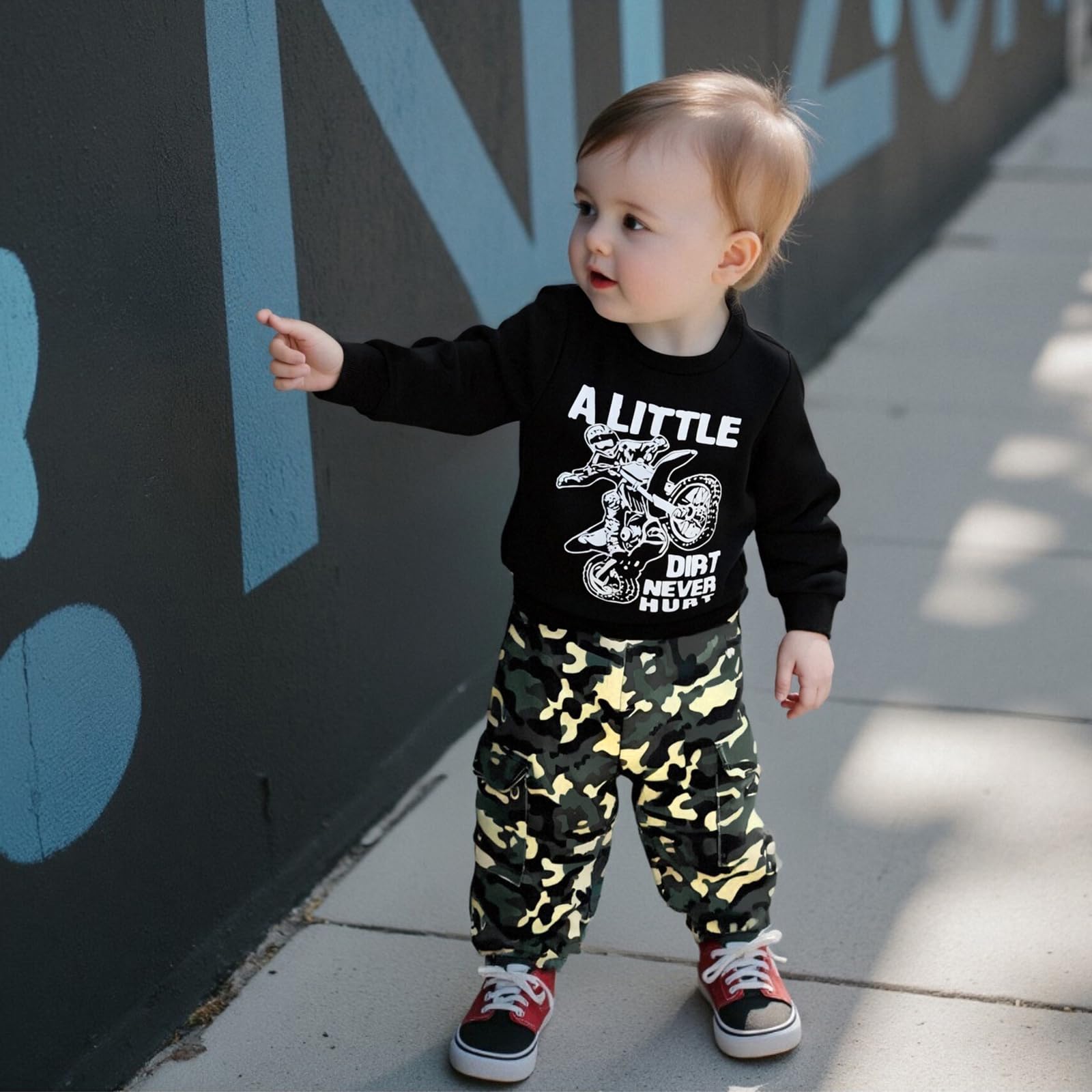 DESIGN:Long sleeve letter car truck excavator print pullover sweatshirt matching with camouflage pants,super personalized and trendy