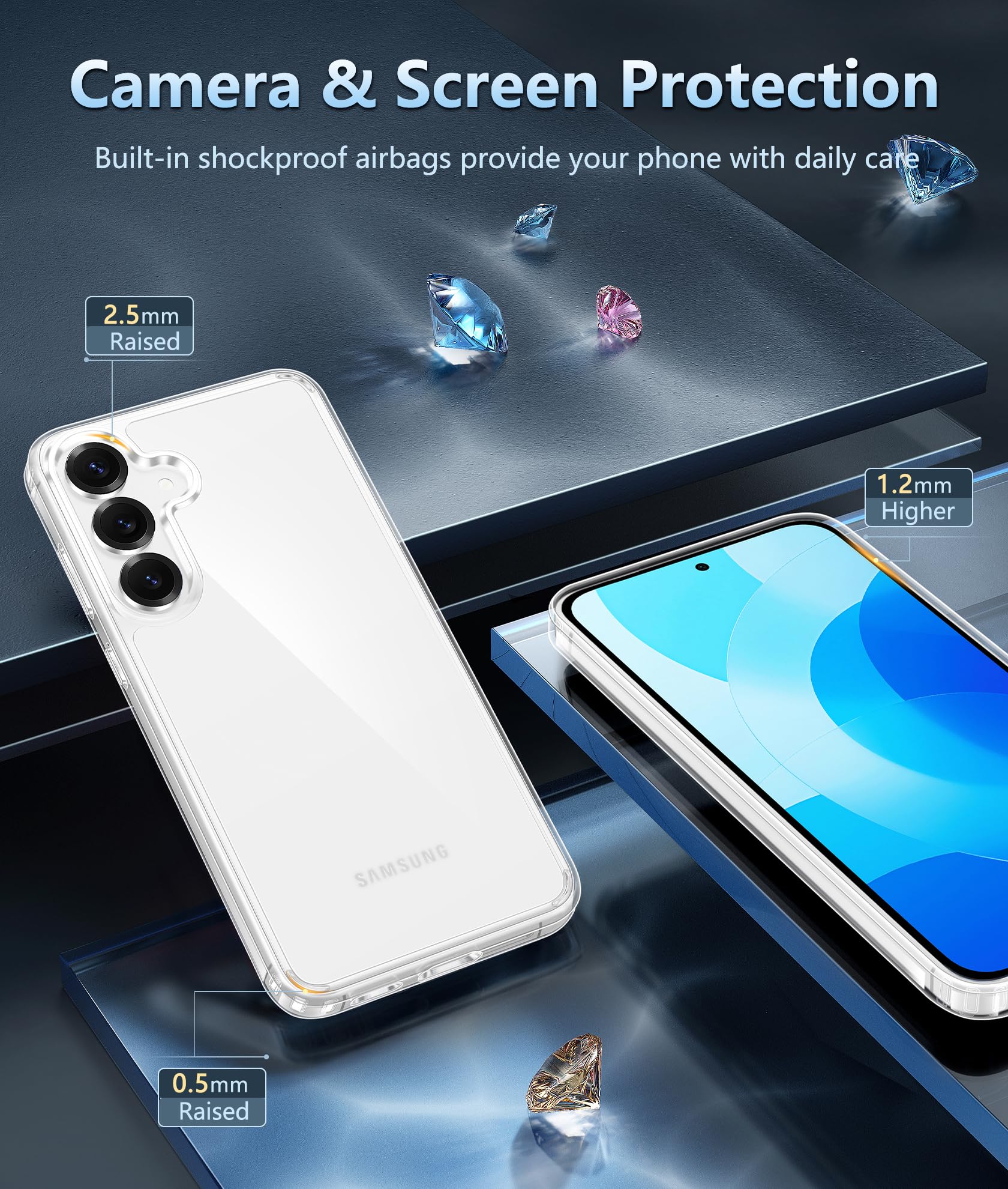 10FT Military Grade Protection: Passed Military Drop Tested up to 10 FT. This Samsung Galaxy S25 FE clear case features a tempered glass screen, a rigid polycarbonate backplane and flexible shockproof TPU bumpers around the edge, plus 4 built-in corner Airbags to absorb impact