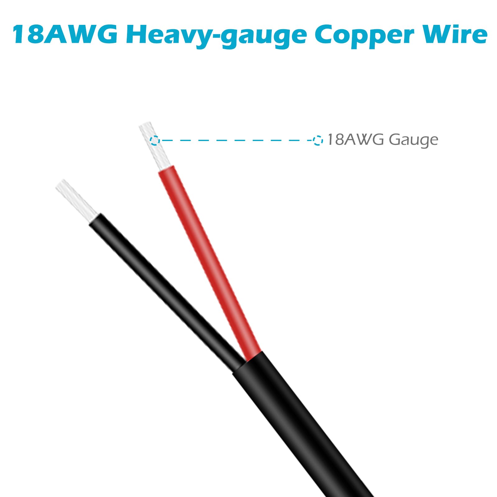 18AWG heavy gauge DC power pigtail cable with high-quality thicker diameter copper conductor provide lower resistivity, secure, reliable, faster and more stable conductivity. The 5.5 x 2.5mm plug adapter and cable wire are all designed in 18 AWG gauge. The 2.5x5.5mm power pigtail cable can provide a more safer DIY solution for DC power connectivity, work with a power adapter or a power supply box.