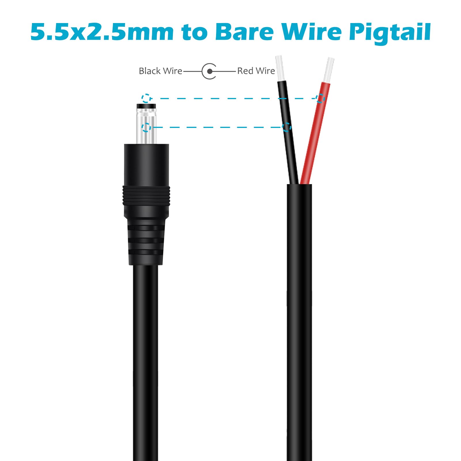 This is 5.5mm x 2.5mm DC power pigtail cable, 5.5x2.5mm male power plug jack adapter to bare wire repair DIY cord.
