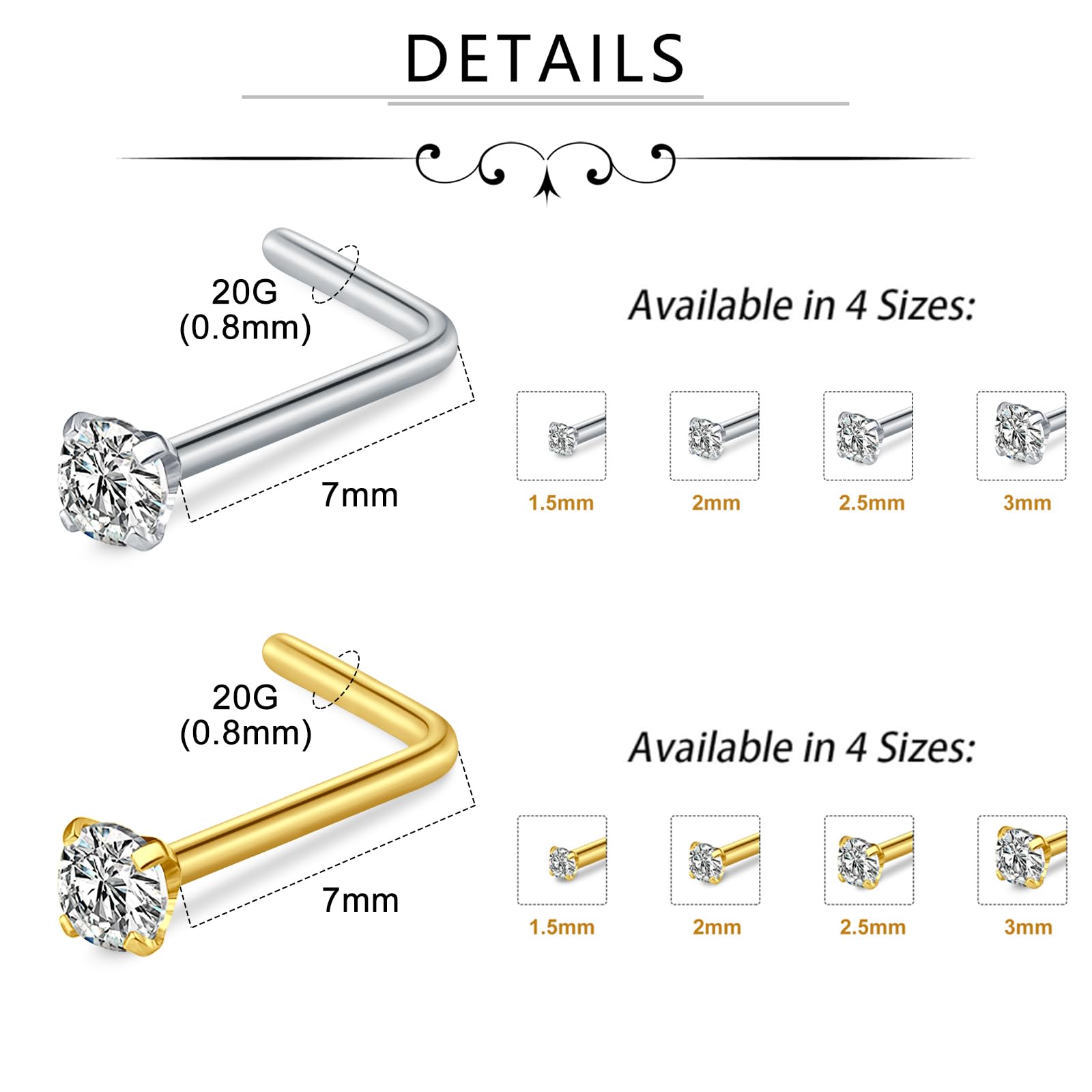 All Gauge--20G(0.8mm); Pin Length: 7mm; Cubic Zirconia Size: 1.5/2/2.5/3mm. The multi-size set is designed to suit your everyday style.