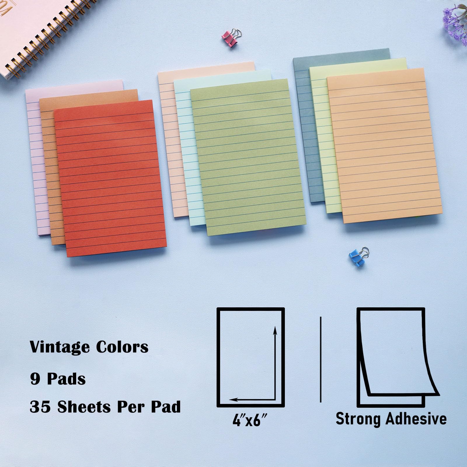 Vintage Colorful Sticky Notes: 9 pads Sticky notes 4x6 contains 9 vintage aesthetic colors. The beautiful lined sticky notes keep important information from going unnoticed, add flair to your everyday life. Very practical