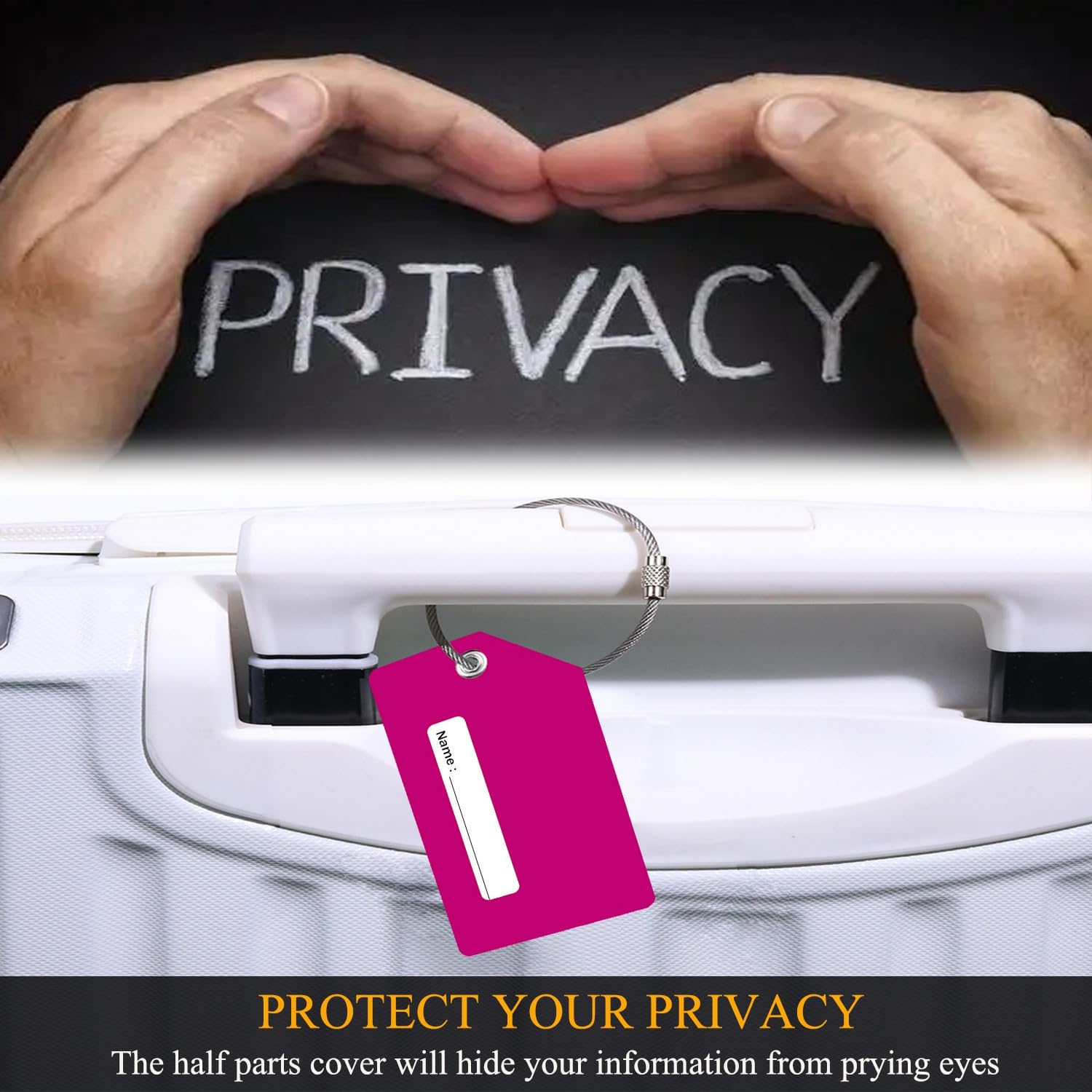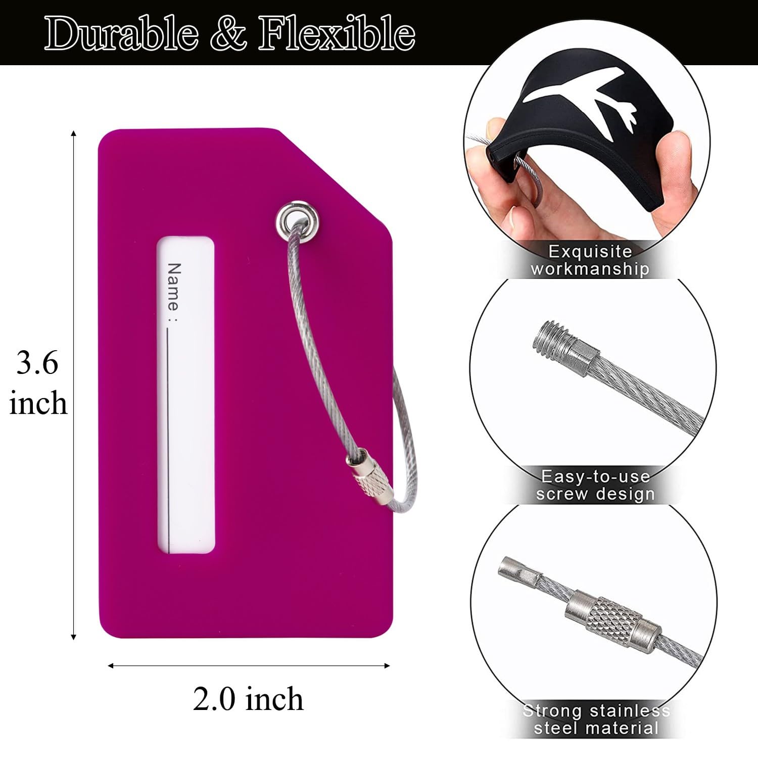 【Flexible & Durable】Our luggage tags Made of quality durable Silicone ability to bend without breaking. The reinformed metal hoop will ensure that your bag tags will be attached to your belongs all the time.
