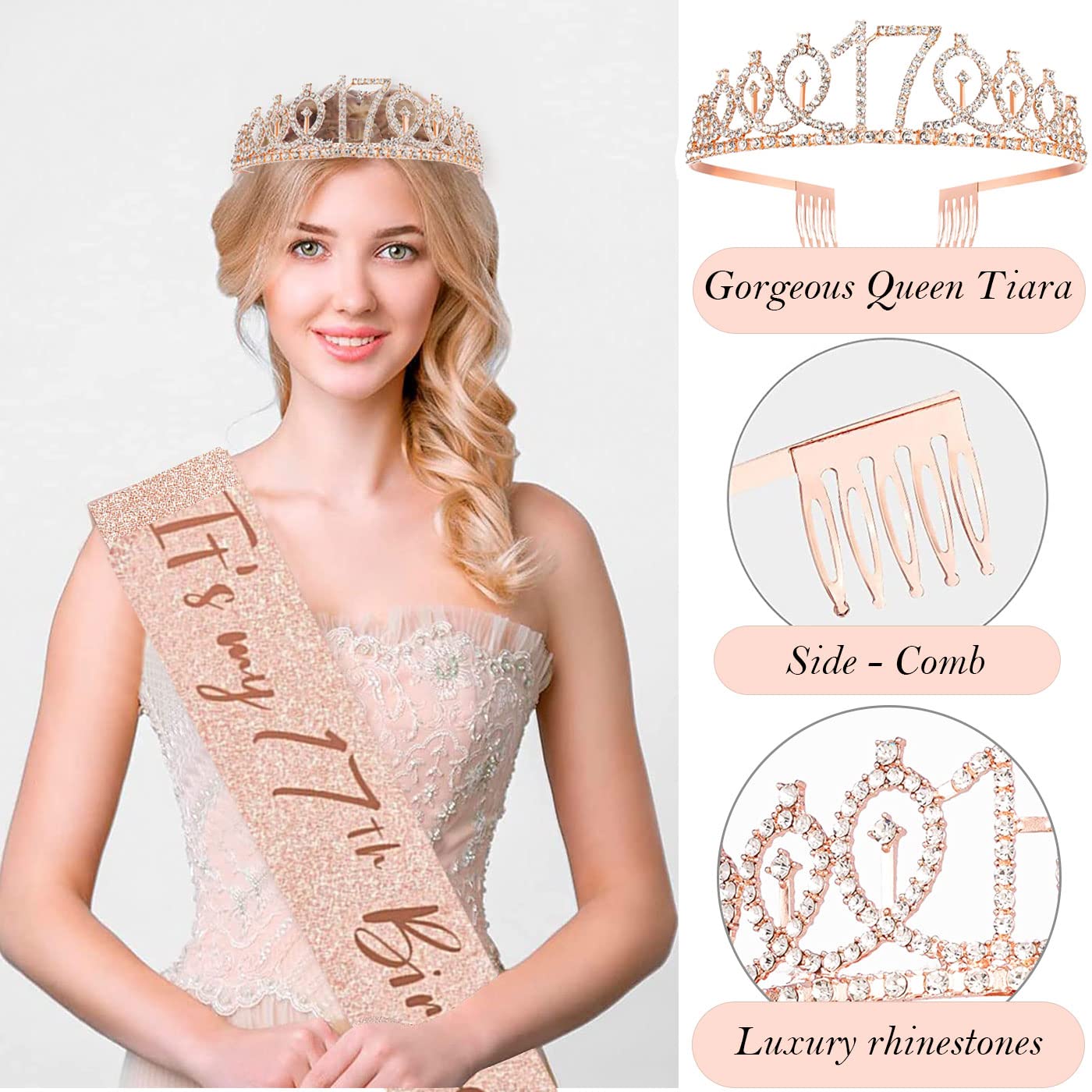Glittery Rose Gold Crown 17: Made of high quality alloy and rhinestone. 17th Birthday Tiara is with combs that make sure it can grip the hair more tightly for fitting girls. Dimension: 5.4” on the front side.