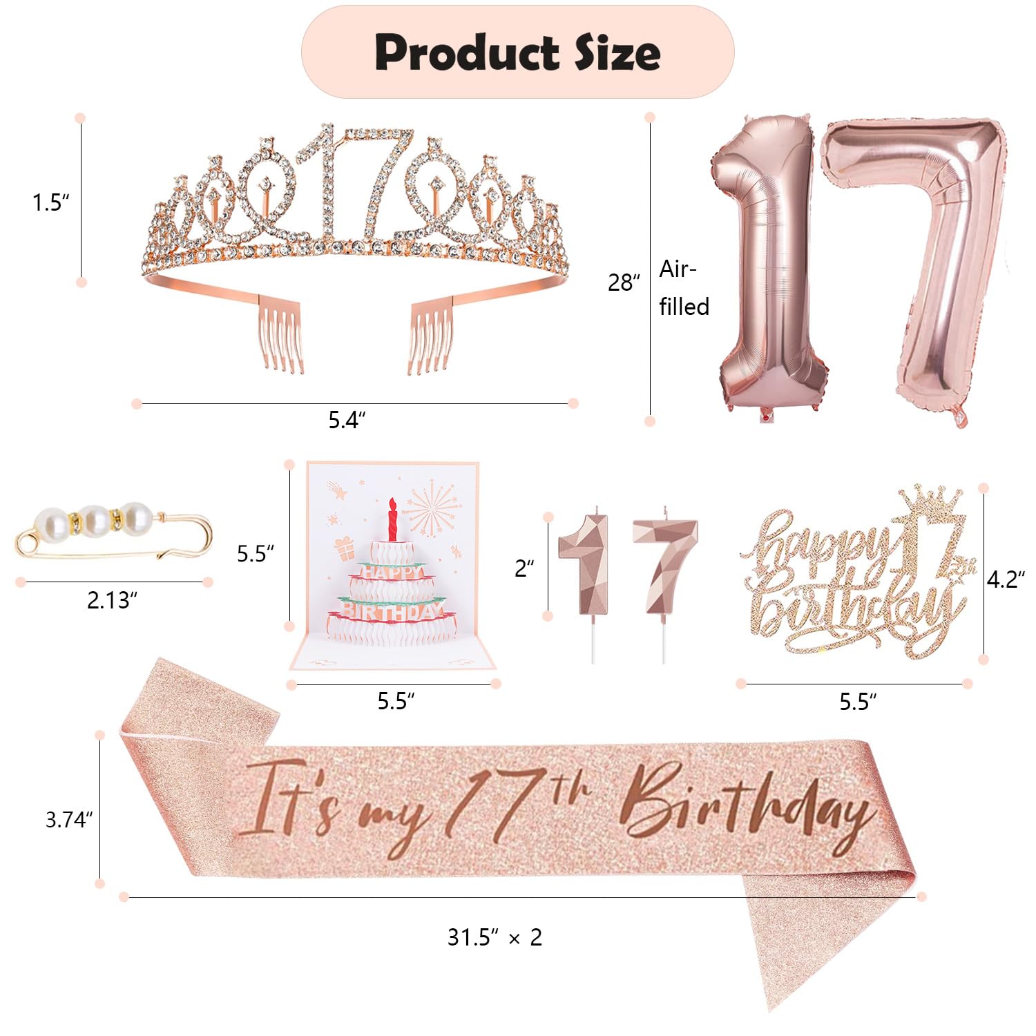 17th Birthday Decorations for Girls: Glittery 17th tiara/crown *1pc, “It’s my 17th birthday” sash *1pc, Happy 17th birthday cake topper *1pc, pearl pin*1pc, 1+7 numeral candles *1set, 1+7 numeral balloons *1set, they are exquisitely packaged in the carton.