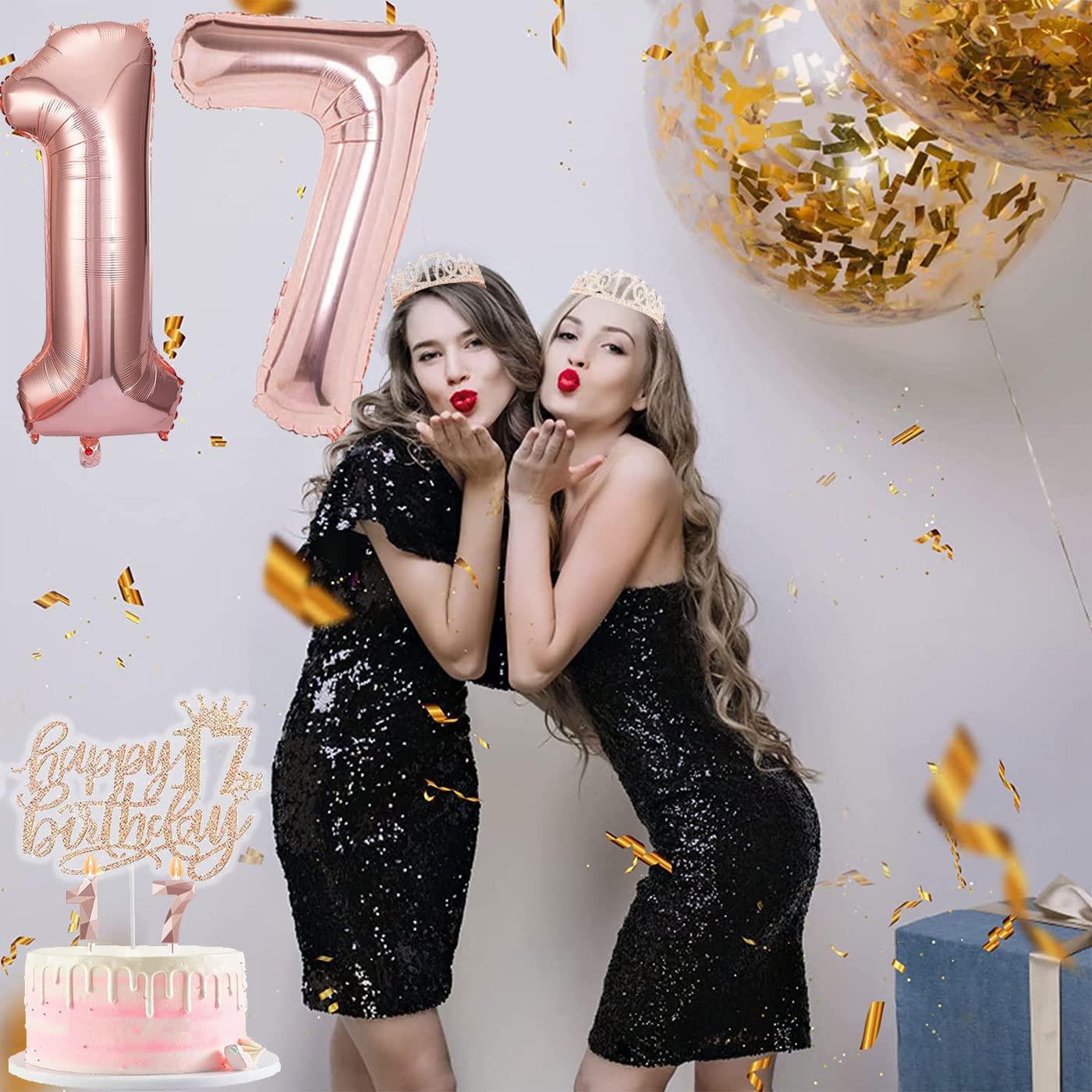 Candles, Balloons and Birthday Cake topper: Number 17 candles are uniquely rose gold with a long burning time, smoke-less. Number 17 balloons are made of high-quality aluminum film that empty balloon is 28 inch. A Rose Gold glittery Happy 17th Birthday cake topper is a funny choice for your party cakes. They are good to embellish your cake and cupcake. Bright glow for creating romantic atmosphere and adding much fun in your 17th birthday party.
