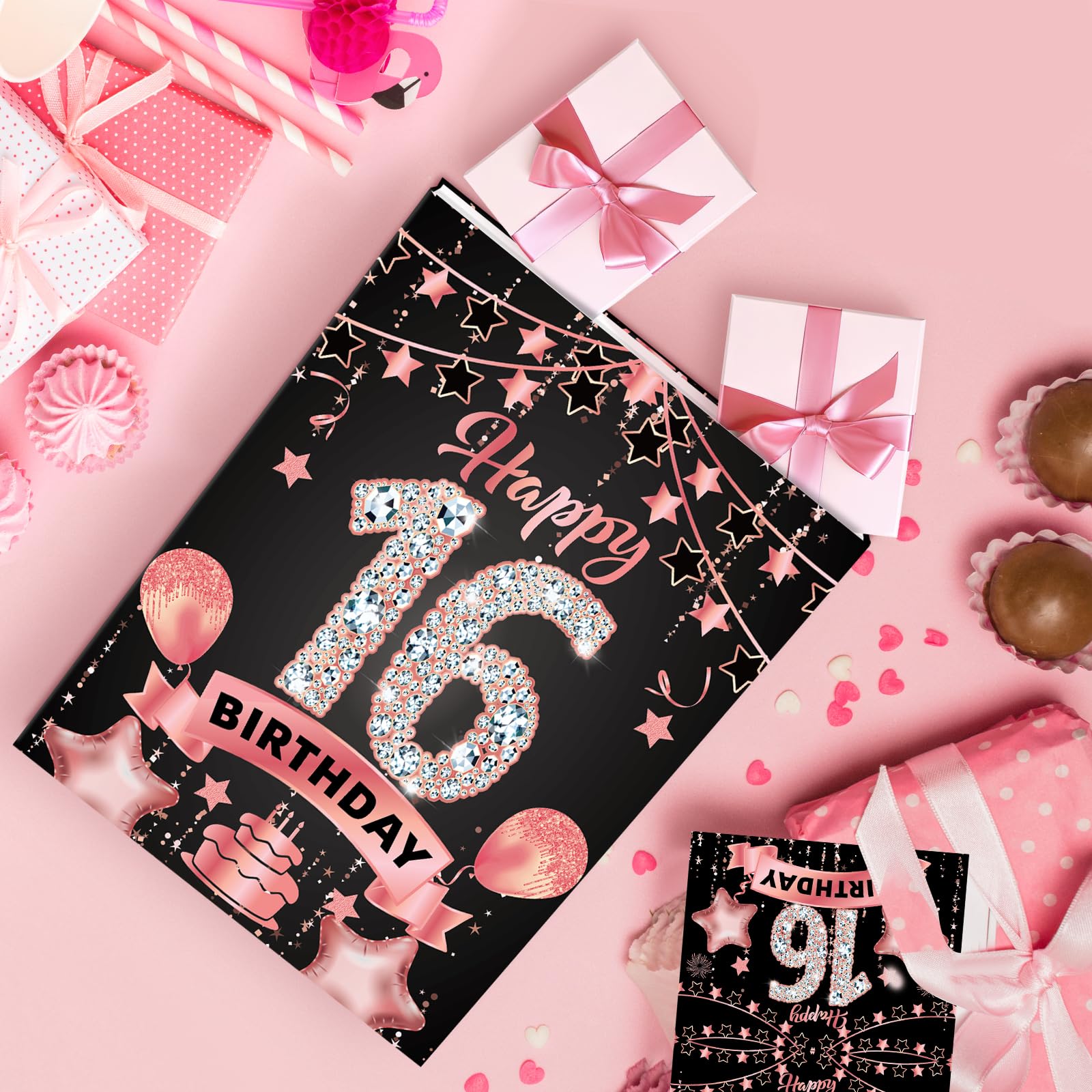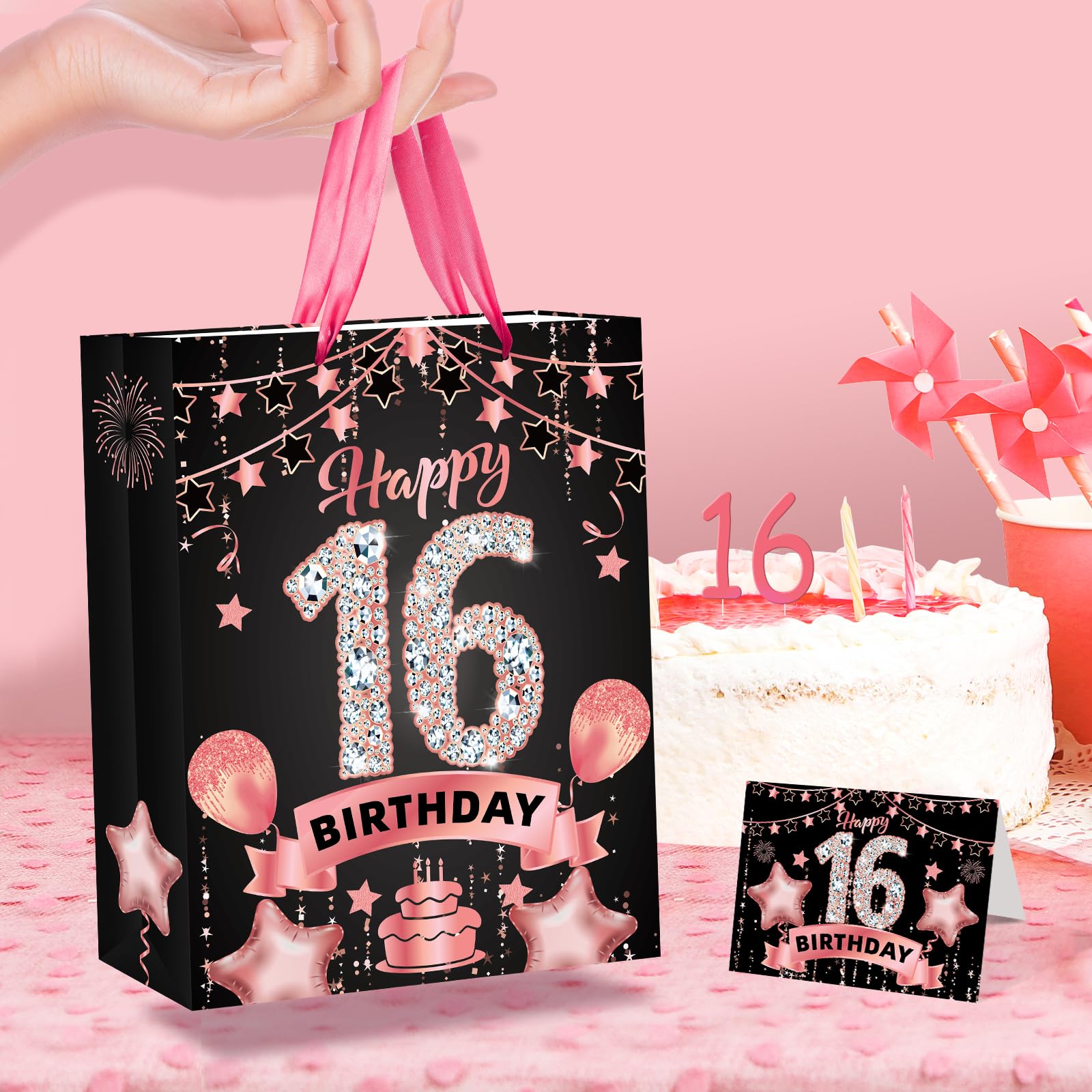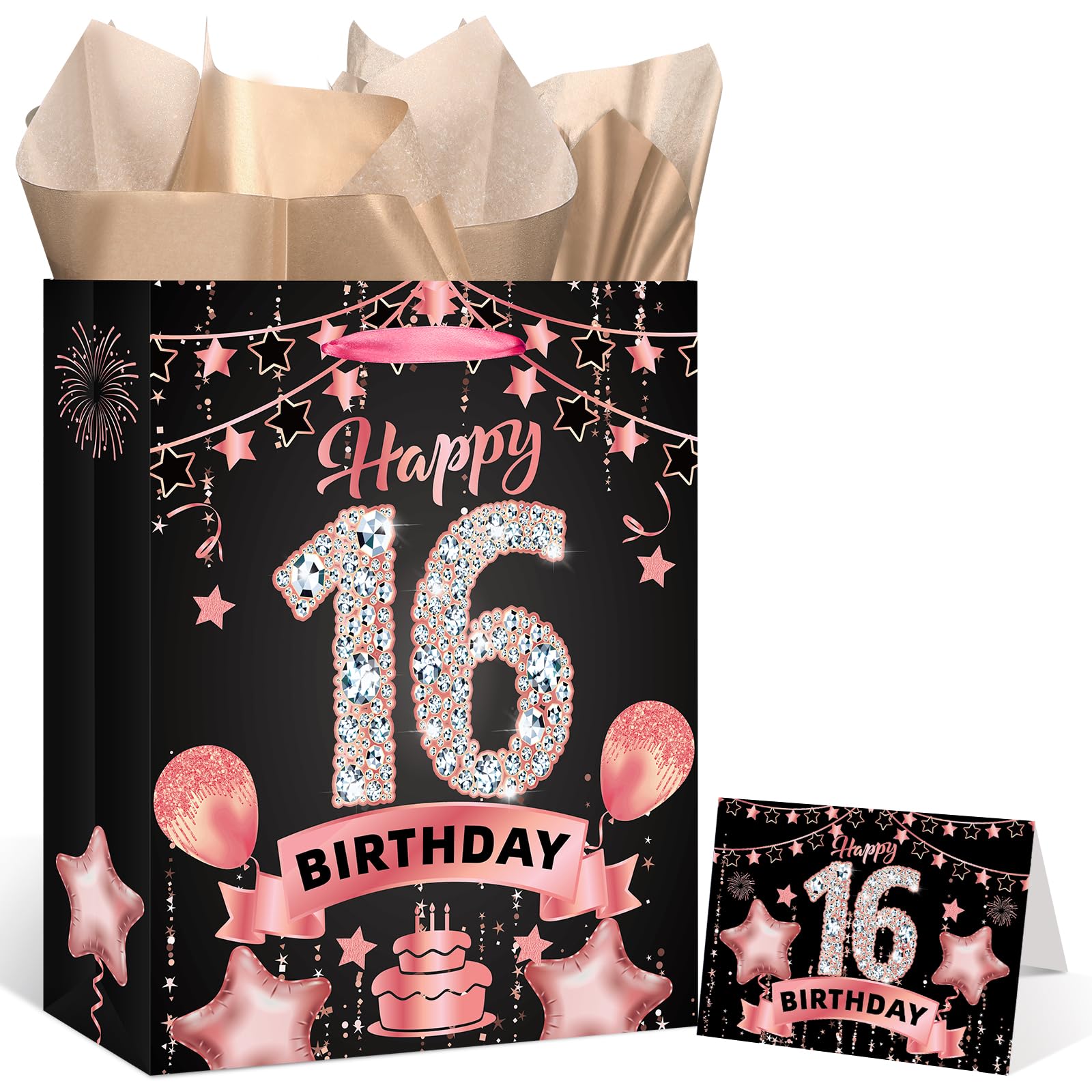 16th Birthday Gift Bag: This rose gold 16th birthday gift set includes 1 piece 16th birthday gift bag + 1 piece 16th birthday greeting card + 3 pieces tissue papers,and the 16th birthday gift bag features exquisite 16th birthday celebration pattern, such as cakes, balloons, fireworks which will leave a deep impression