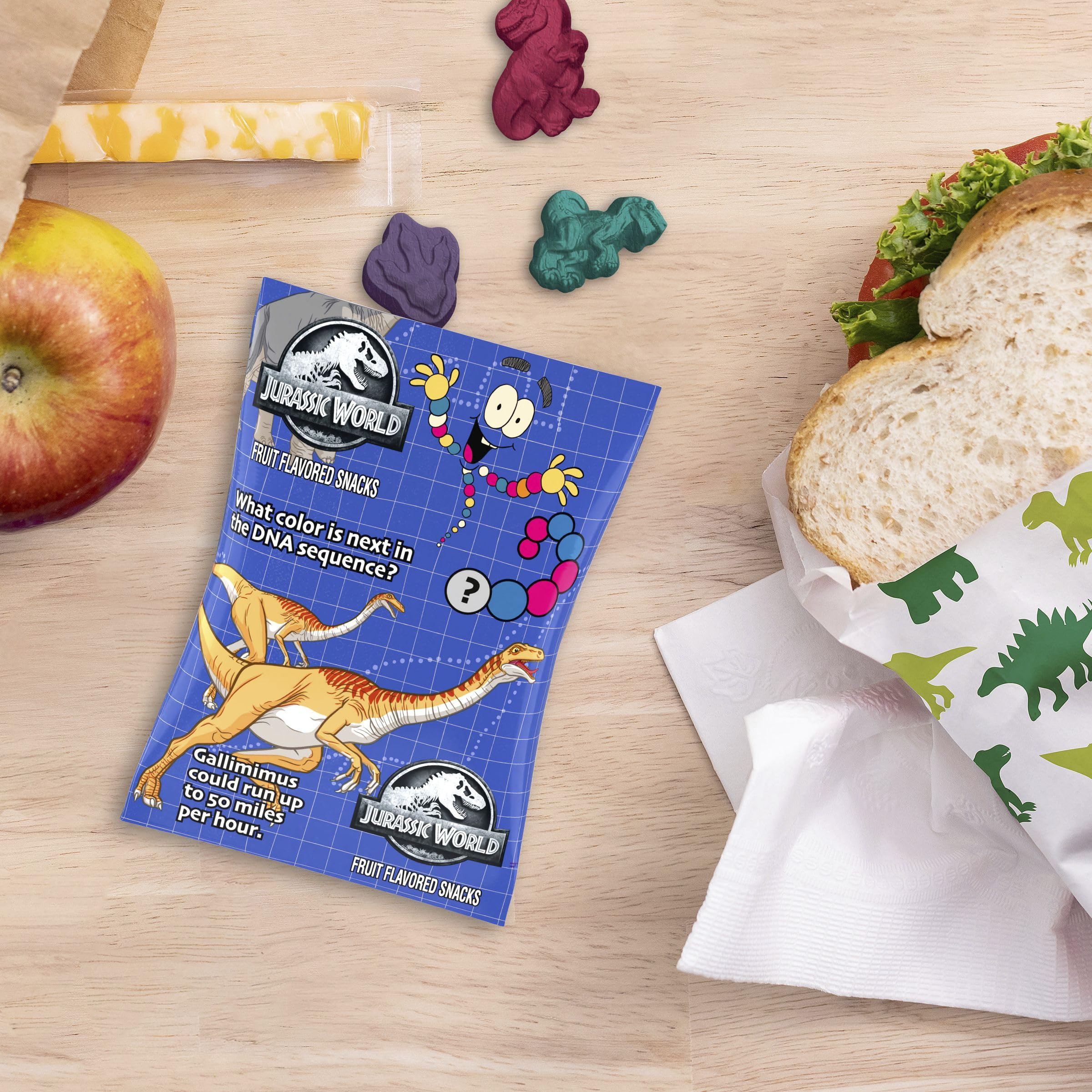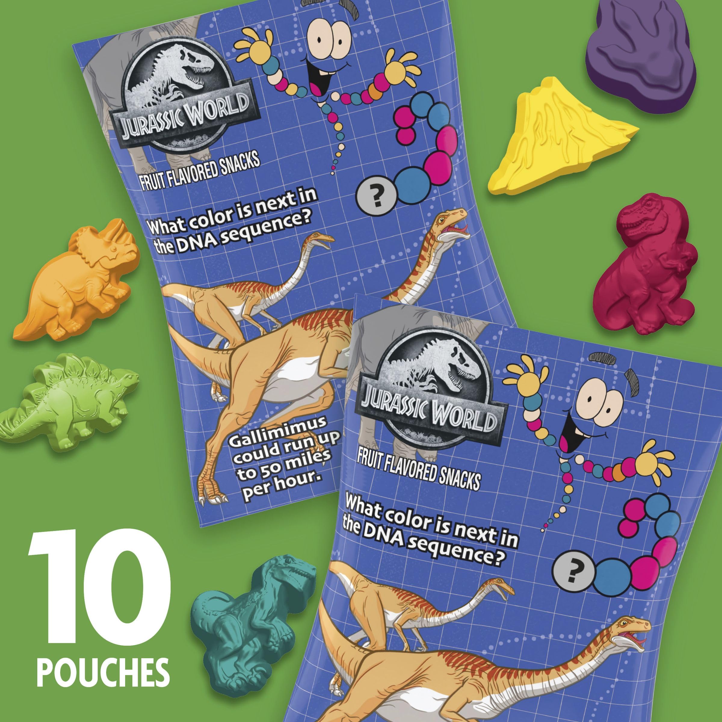 CONTAINS: One cardboard box of chewy Jurassic World Fruit Flavored Snacks, Gluten Free, 10 Ct, 8 oz