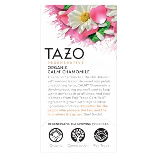 TAZO CALM CHAMOMILE: This elegant, flavorful tea is a soothing blend of chamomile and hibiscus flowers, spearmint, rose petals, lemongrass, blackberry leaves, and peppermint