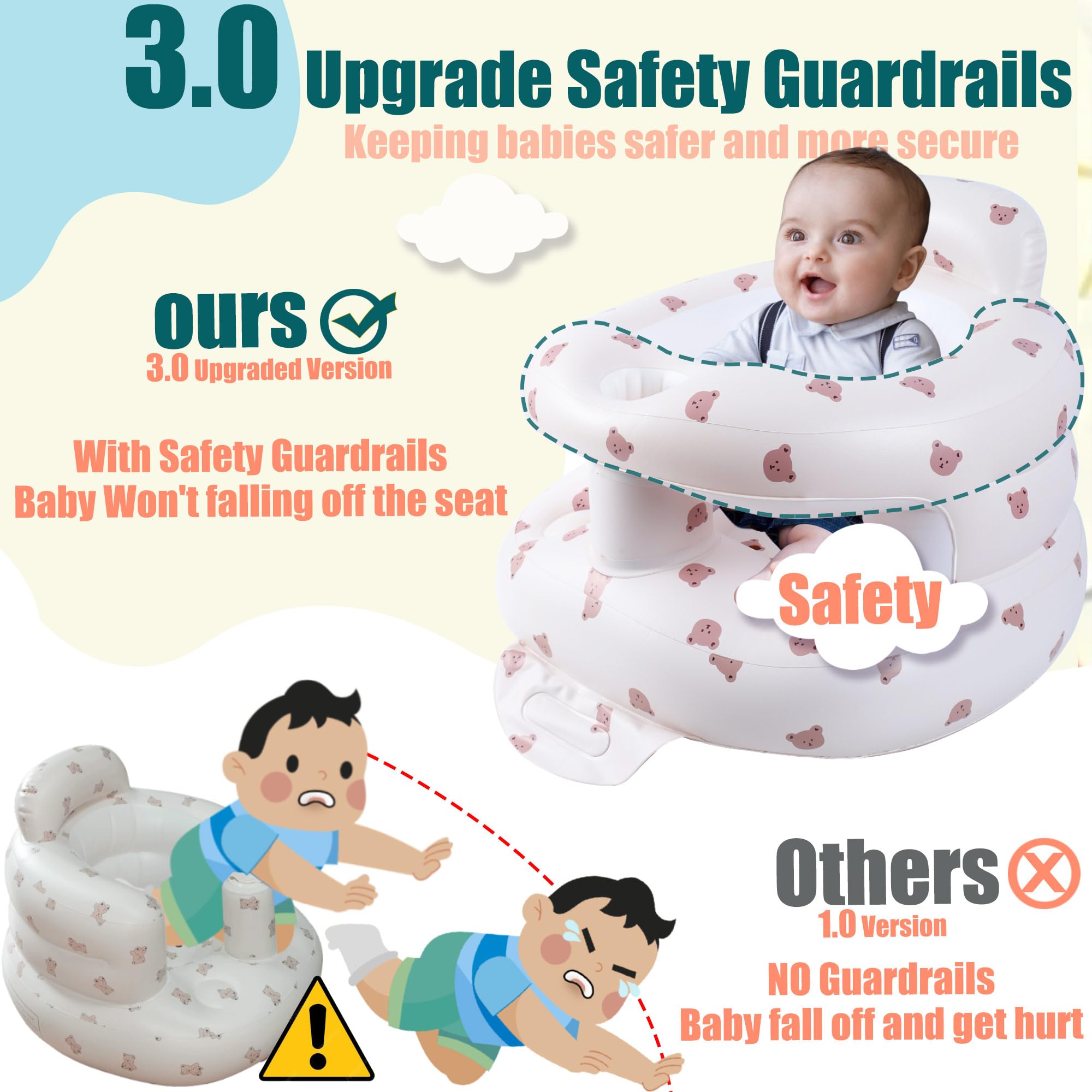 【3.0 Upgrade Version】Bavbiiy inflatable baby chair upgraded the safety guardrails, because babies aged 3-36 months, sit me up floor seat for baby, tend to lean forward, and without a safety guardrails, babies are prone to falling, fell head first into the ground, This dangerous concern is addressed in our 3.0 Version.inflatable baby chair baby seats for infants for sitting up.