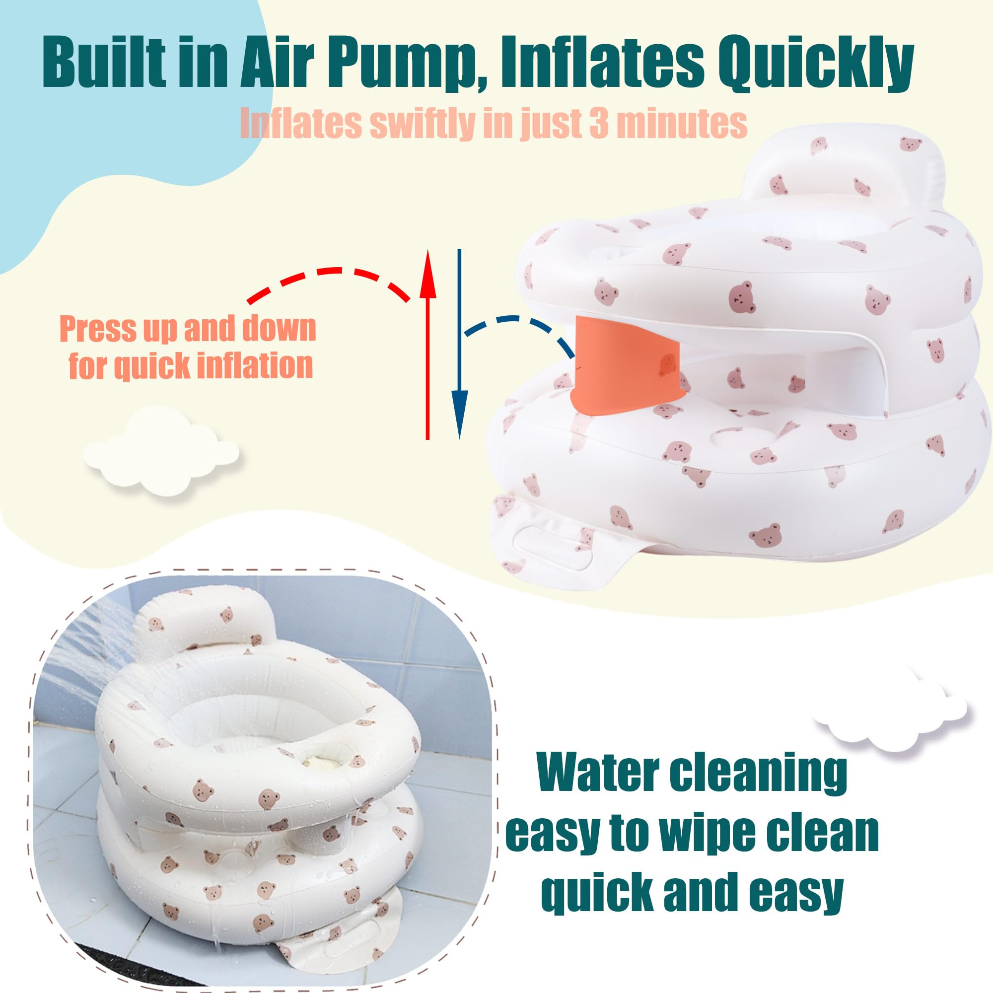 【 Built in Air Pump, Inflates Quickly】Our inflatable baby feeding chair, Simply press up and down on the built-in pump and it will be fully inflated in about 3 minutes.Supporting direct cleaning with water, Easy to wipe clean quick and easy, inflatable baby seat inflatable baby chair Blow Up Baby Chair