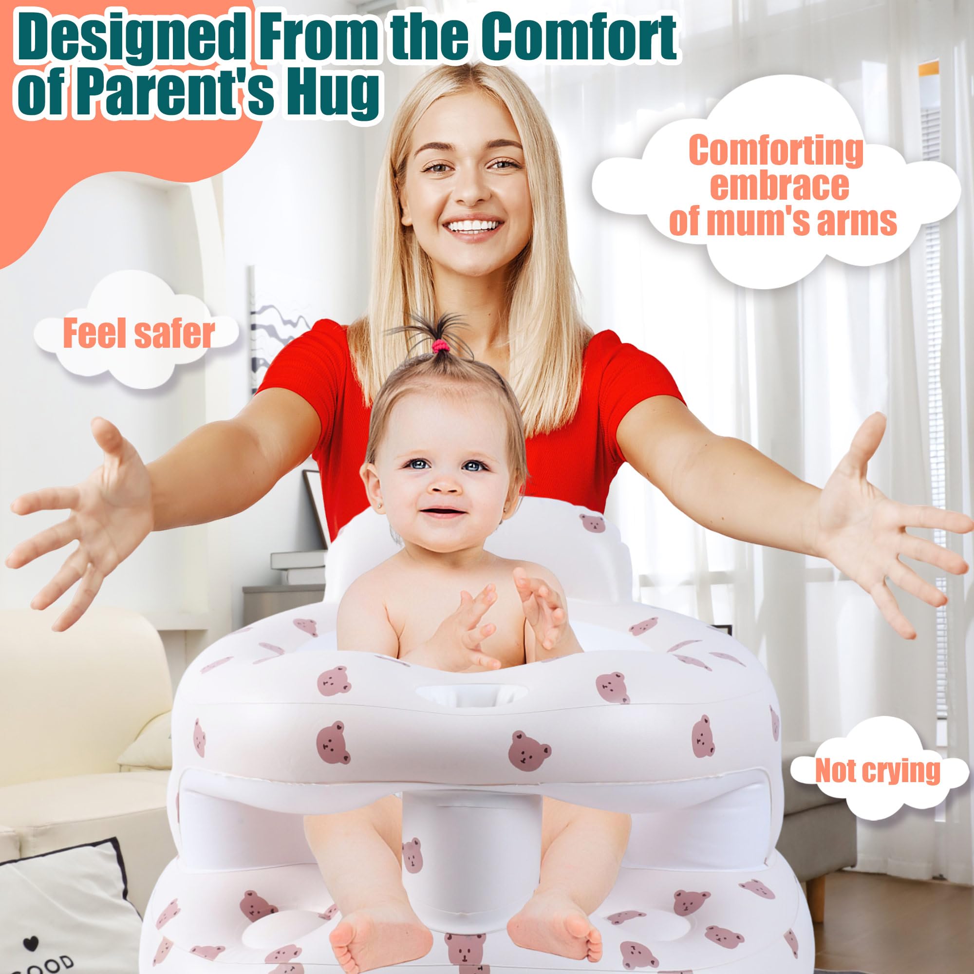 【Designed From Parent's Hug】Babies love their parents' cuddles the most, Bavbiiy inflatable baby chair offers babies a soft, reassuring hug while safeguarding them from accidental bumps. The curved backrest offers soft yet firm support, enhancing protecting babies spine, sitting posture and comfort.inflatable baby seat with Guardrails for Babies 3-36 Months baby seats for infants for sitting up
