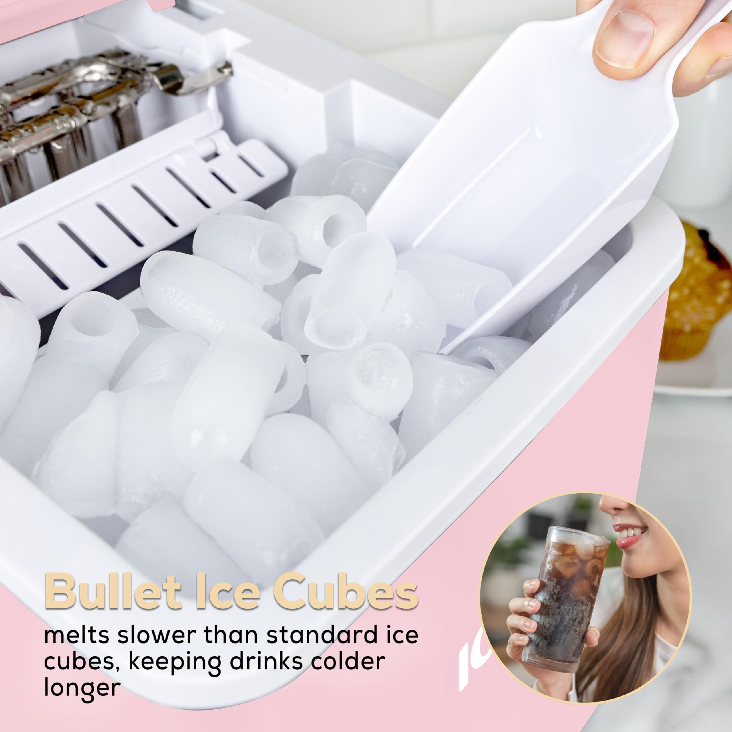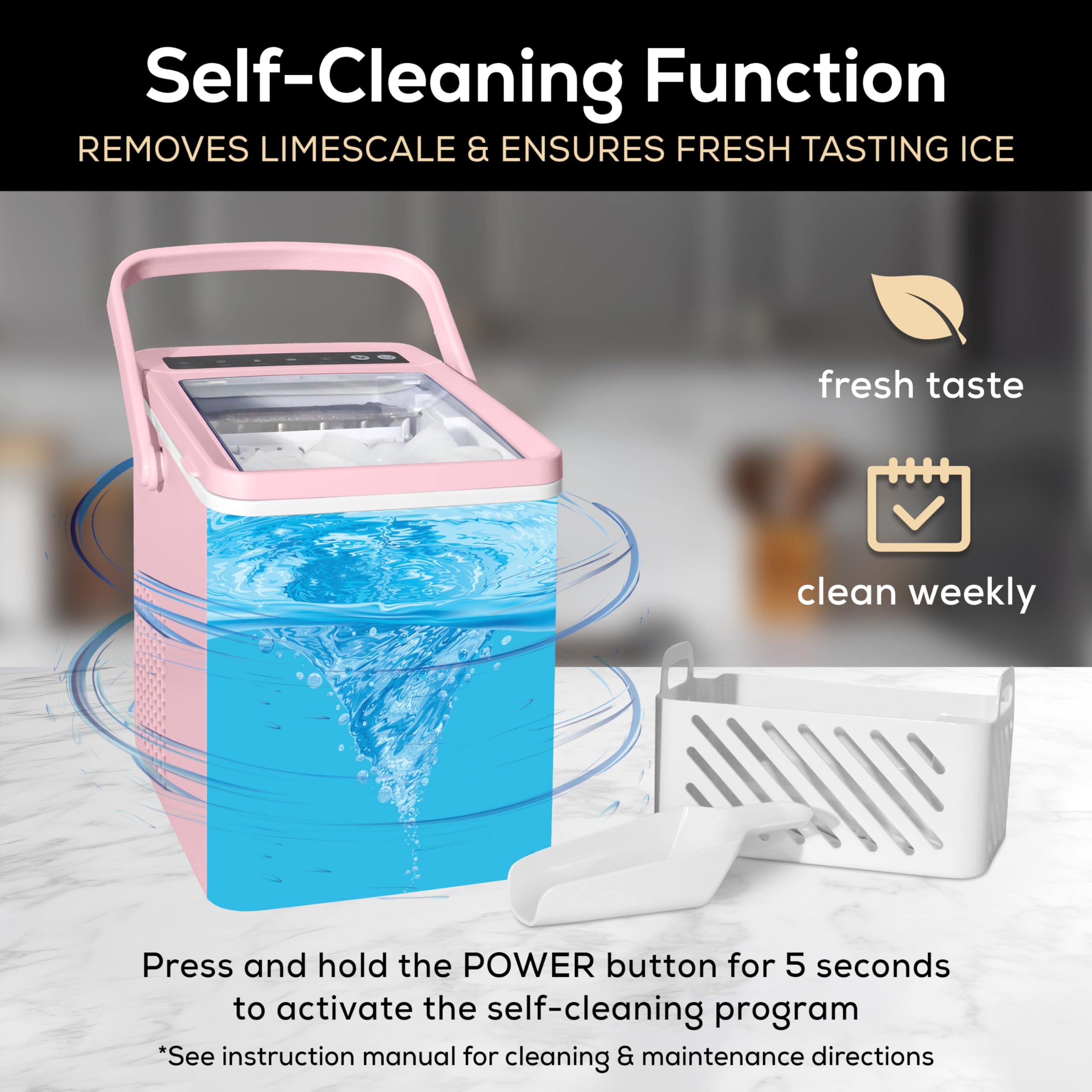 Chill in Seconds: Imagine never running out of ice-this pink ice maker churns out 26 pounds a day and nine cubes in seven minutes for smoothies or cocktails. Its sleek, space-saving design and LED panel make this countertop ice maker a stylish kitchen companion. With an auto-clean cycle, this self-cleaning ice maker keeps things pristine so you can savor every chilled moment with friends.