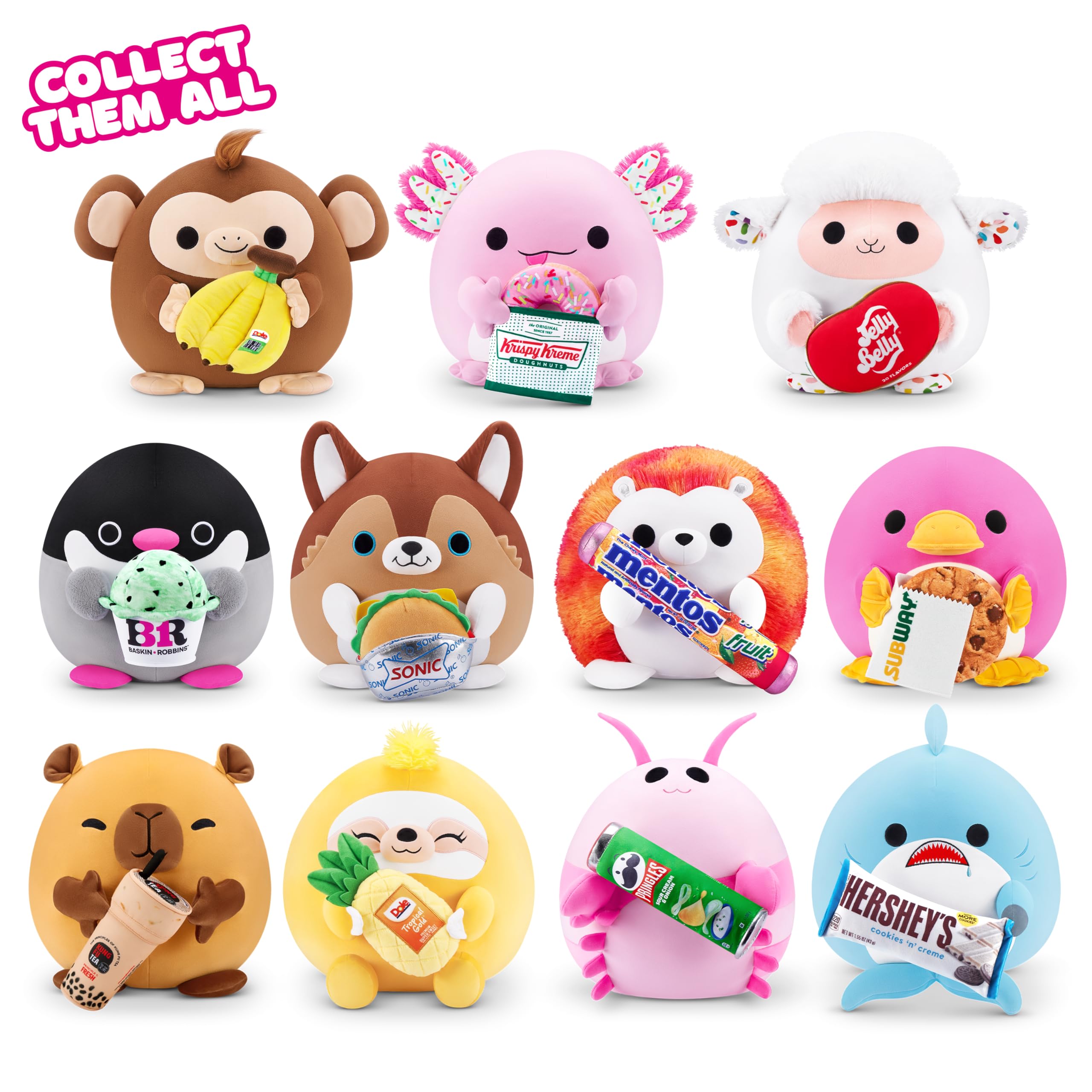 Snackles are the super soft ultra squeezable plush that comes paired with your favorite mini brands made squishy! Satisfy your craving for cuddles with this cuddly 16 inch plush! Each Snackle comes with a little description to tell you all about your new plushy pal! Don’t go hungry, there's 10 new Snackles to collect! Will you find the Hersheys Shark or maybe the Krispy Kreme Axolotl? Hunt for your favorite tasty pairing with Snackles!