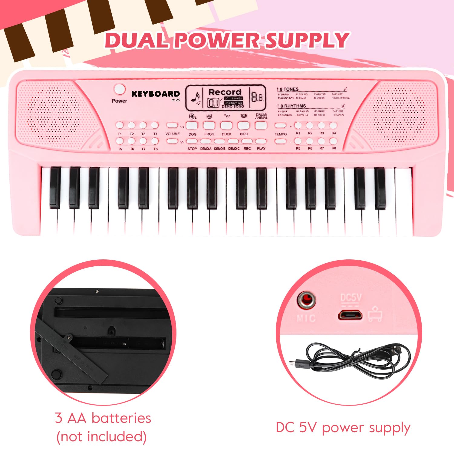 3 AA Batteries Powered/ USB Cable -- Electronic kids keyboard powered by 3 AA batteries (Not include) or USB cable. Dual speakers allow children to enjoy the world of music. Kids toy piano is a great gift for Birthdays, Christmas or other festival.