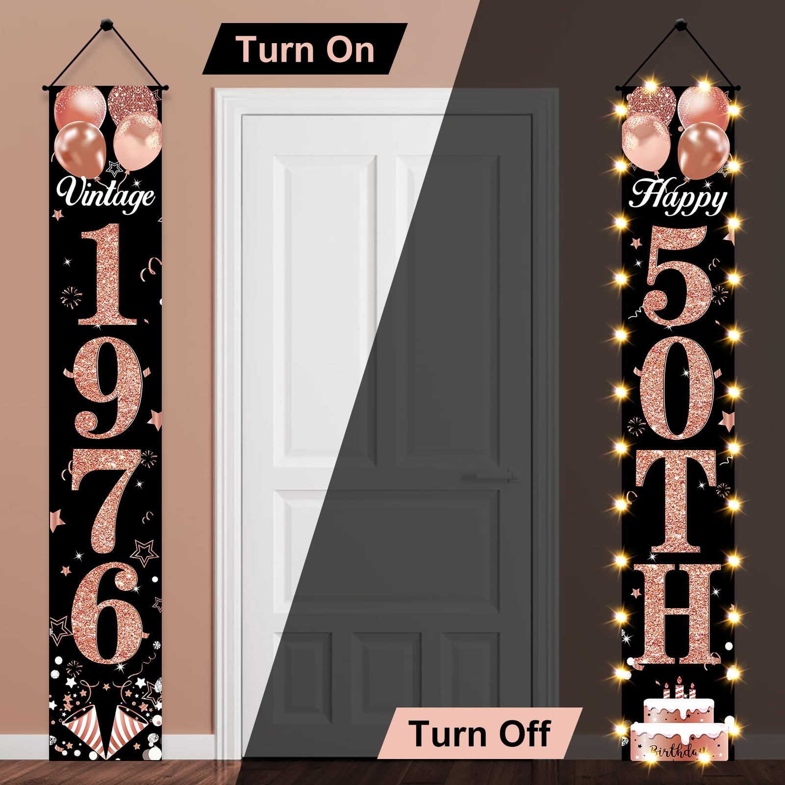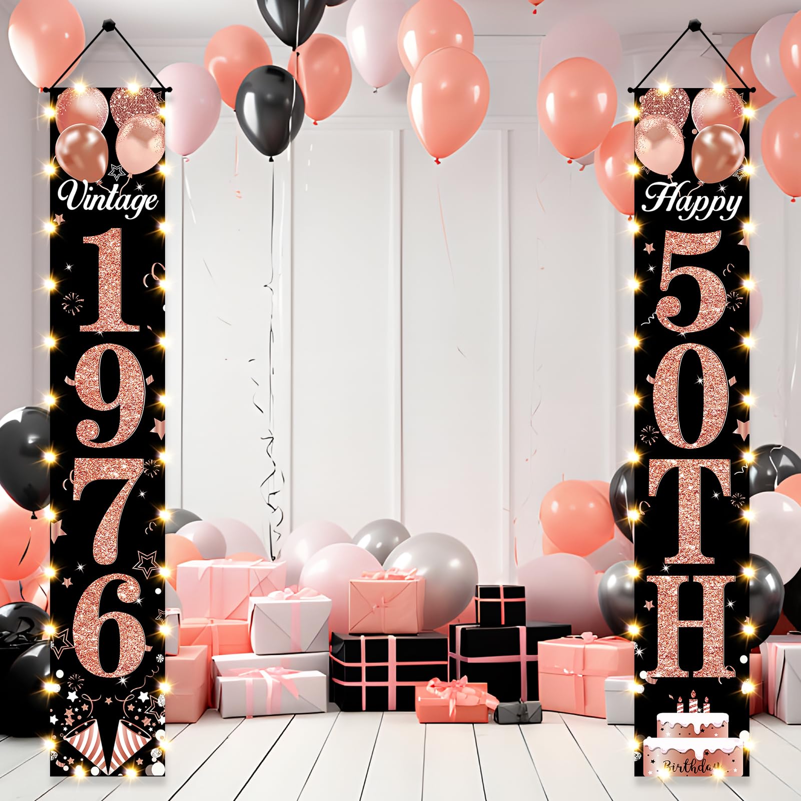 [50th Birthday Door Banner]: Clearly blends rose gold and black designs, adding elements such as birthday cake and balloons to create a unique 50th birthday for you