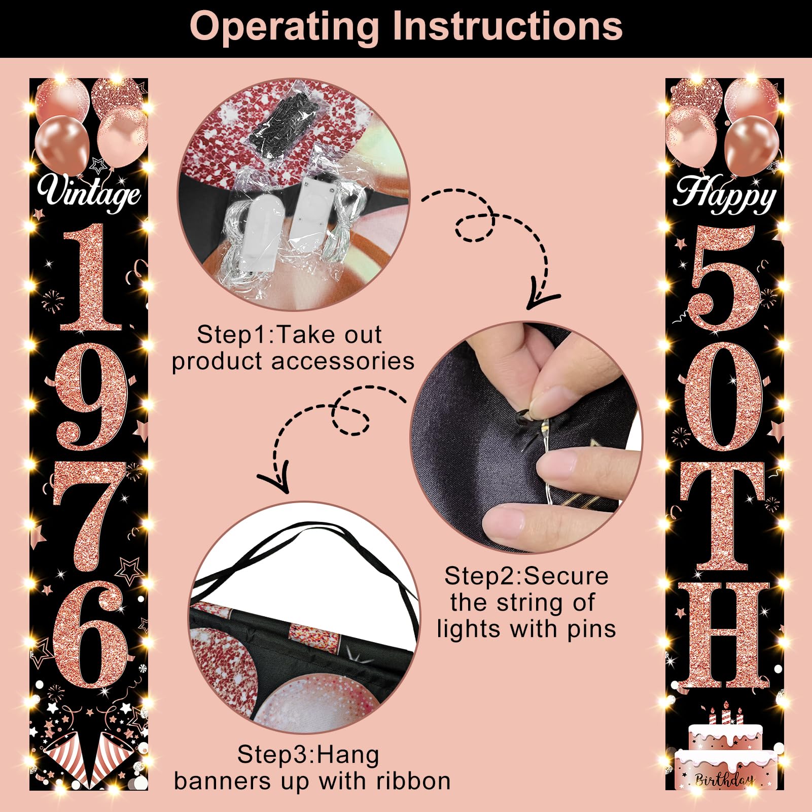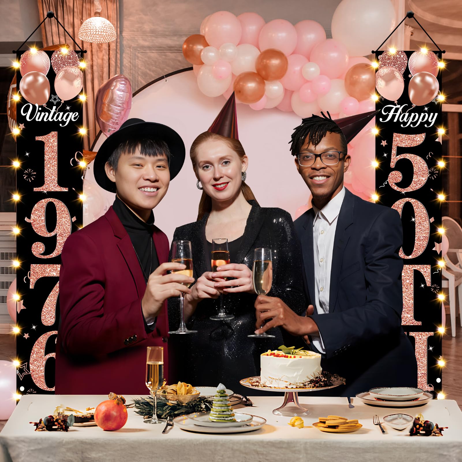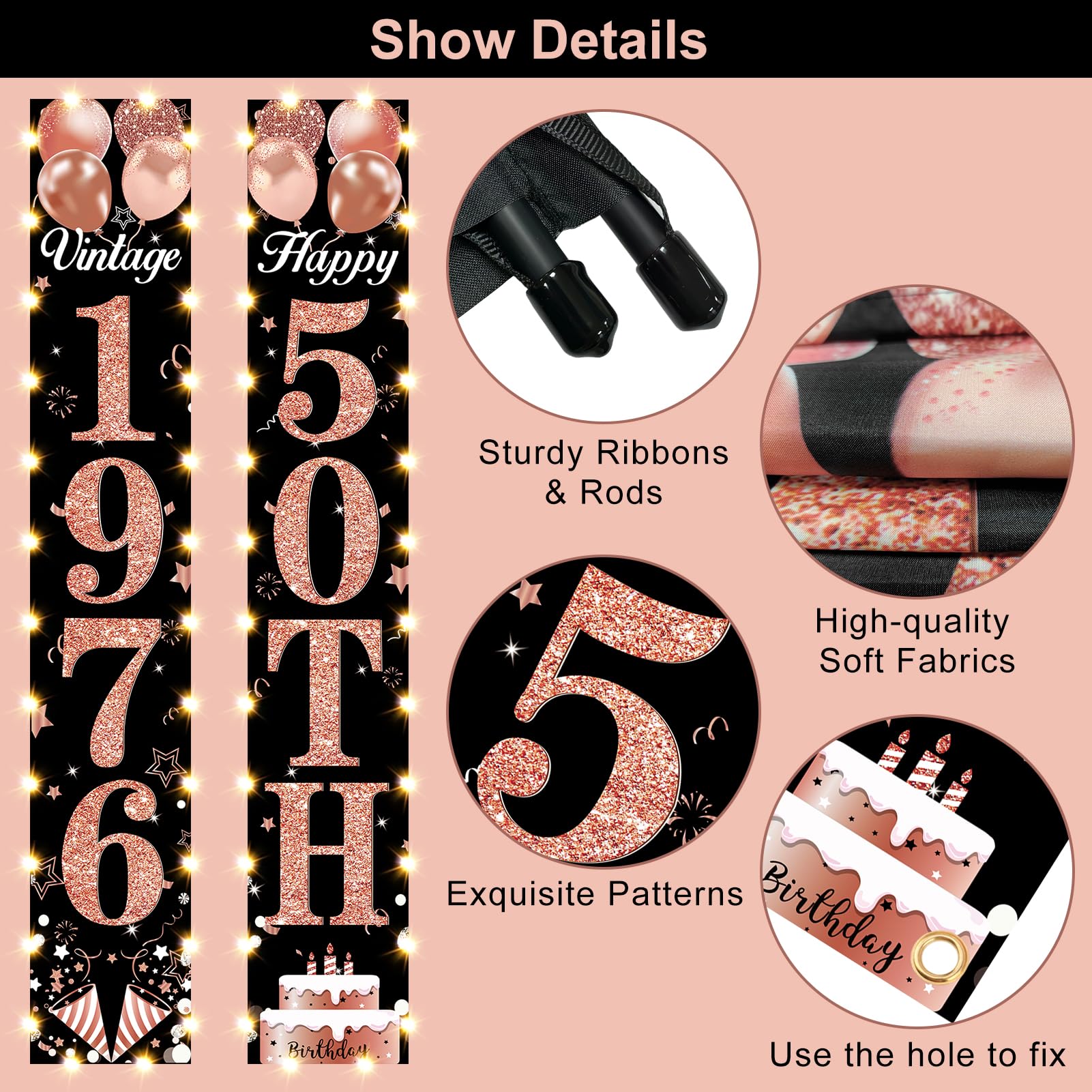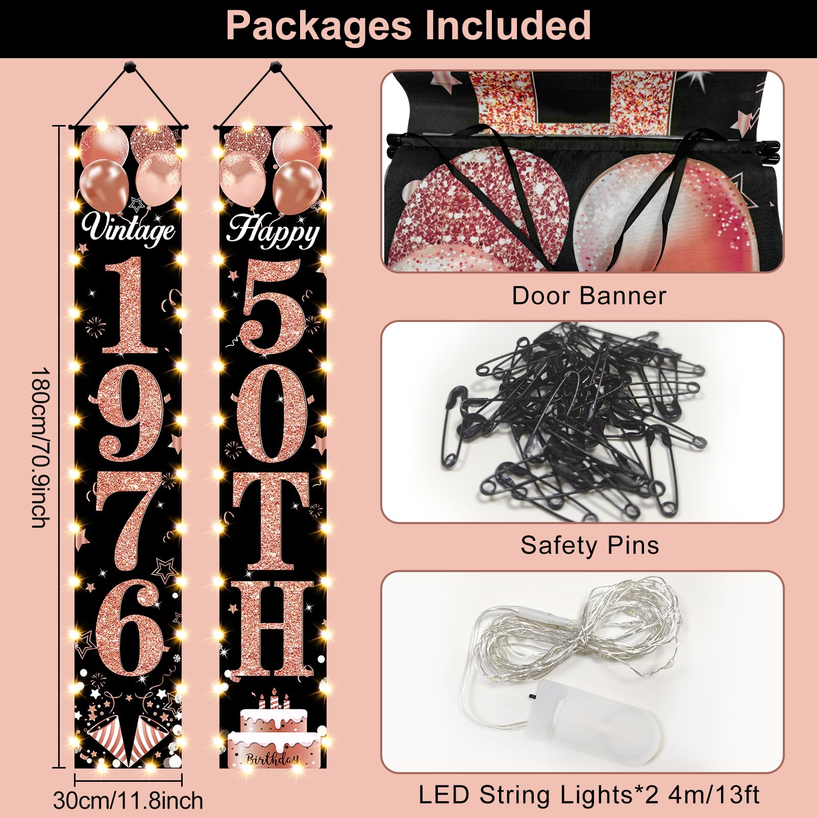 [50th birthday decorations]: The rose gold and black Happy 50th Birthday Party door banner decorations are your perfect choice. The size 70.9 * 11.8 inches, including 1pcs "1976" door banner and 1pcs "50th" door banner