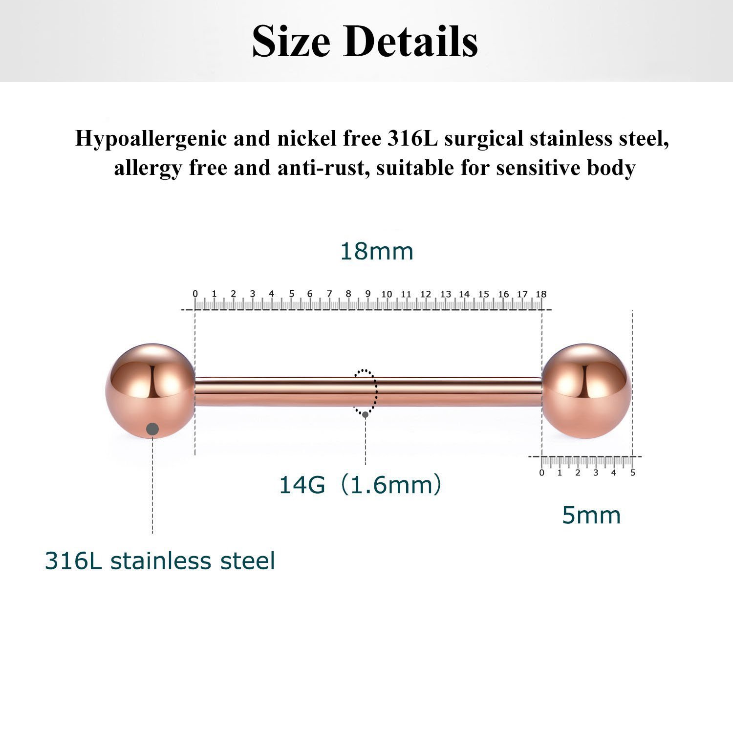 Size -- 14 gauge (1.6mm), bar length: 3/4"(18mm), ball Dia.: 5mm; both ends of balls can be screwed on and off, convenient to use