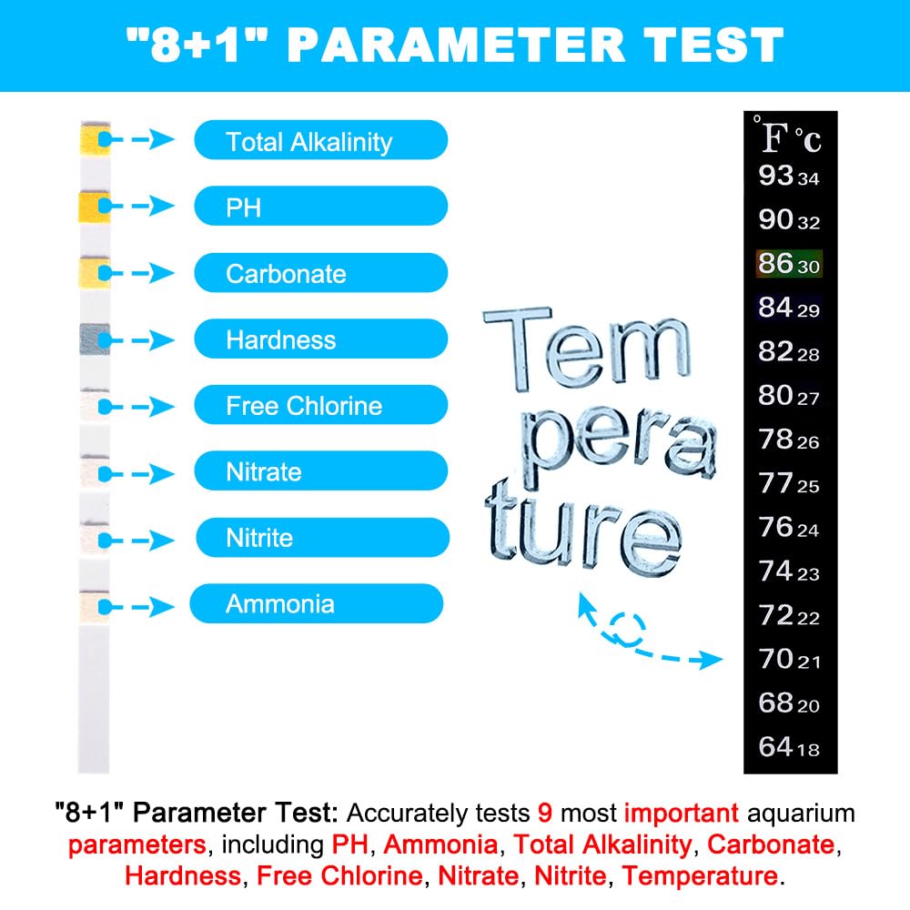 【"8+1" Parameter Test】: Fish are beautiful while it's also fragile. Many factors can affect their health. So always monitoring various parameters changes in the water is compulsory course for every aquarist. DaToo aquarium test kit has an extra thermometer that provides you with 9 most important aquarium parameters including PH, Ammonia, Total Alkalinity, Carbonate, Hardness, Free Chlorine, Nitrate, Nitrite, Temperature. Lets you easily know the quality of your fish tank water!