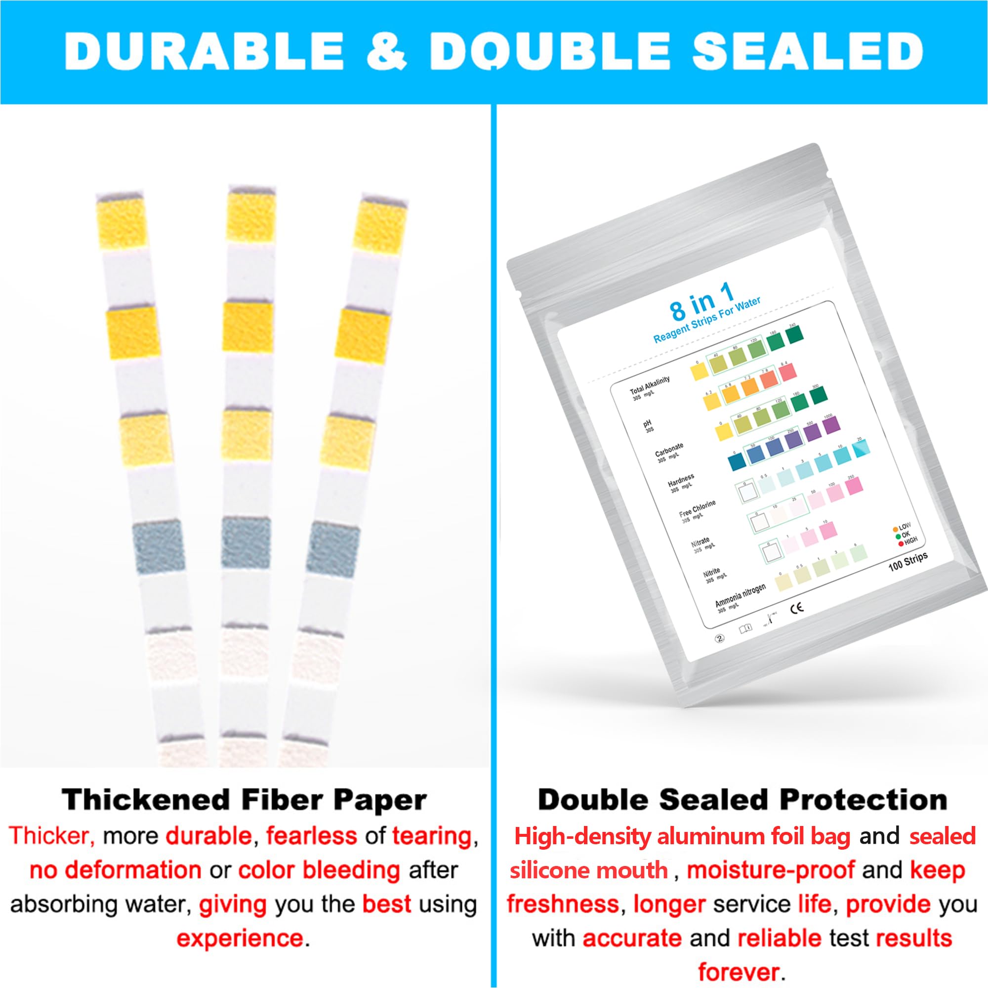 【Durable & Double Sealed】: Unlike ordinary aquarium test strips, DaToo uses thickened fiber paper as test strips material, which makes DaToo aquarium test strips thicker, more durable, fearless of tearing, no deformation or color bleeding after absorbing water, giving you the best using experience. High-density aluminum foil bag and sealed silicone mouth, double sealed protection, moisture-proof and keep freshness, longer service life, provide you with accurate and reliable test results forever.