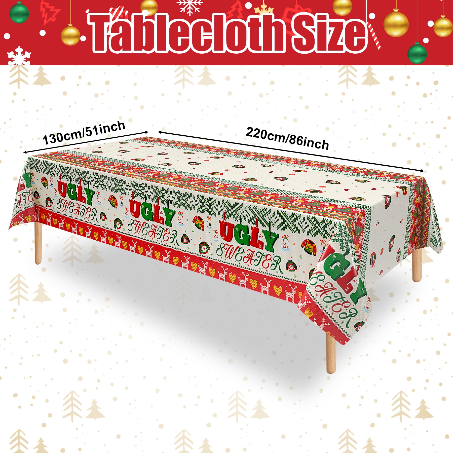 Package Includes:3 x ugly sweater tablecloths Features: 1. Tabletop protection 2. Party decoration 3. Easy cleanup Size: 51 x 86 inches Material: Plastic Remarks: 1. Please allow slight deviation in size. 2. Colors may vary slightly due to different screen displays. 3. Plastic odor may exist, please ventilate upon receipt.