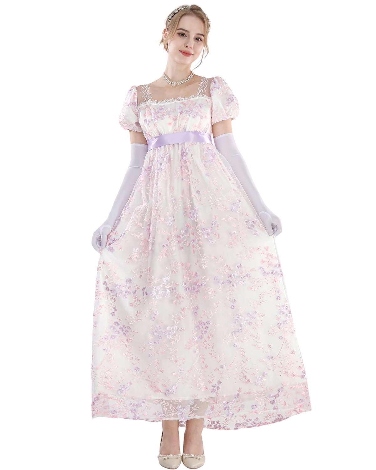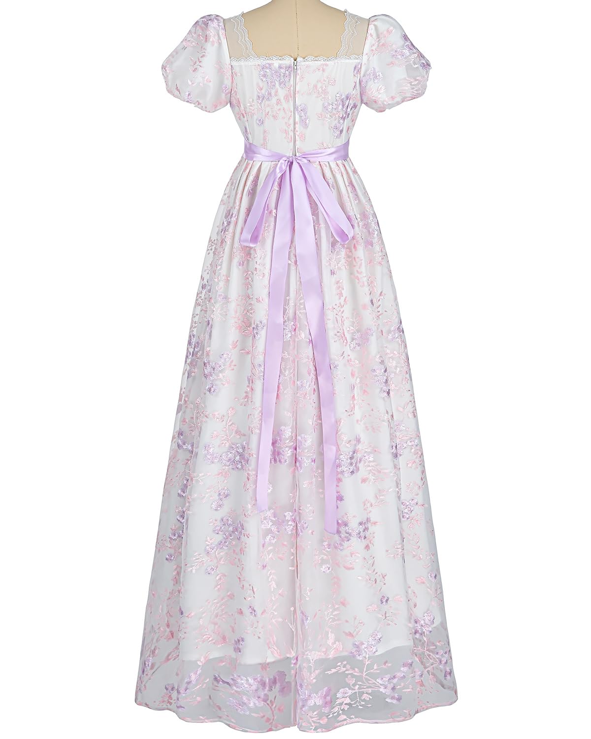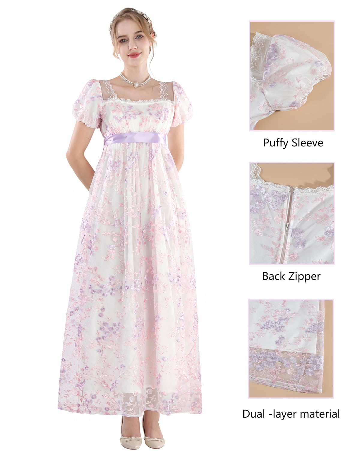 【Style】The regency era dress is square neck with a yellow ribbon. Short puffy sleeves, lovely dress. Back Zipper, easy to wear and off. The shoulders are beautifully designed with mesh, so be careful if you have sensitive skin