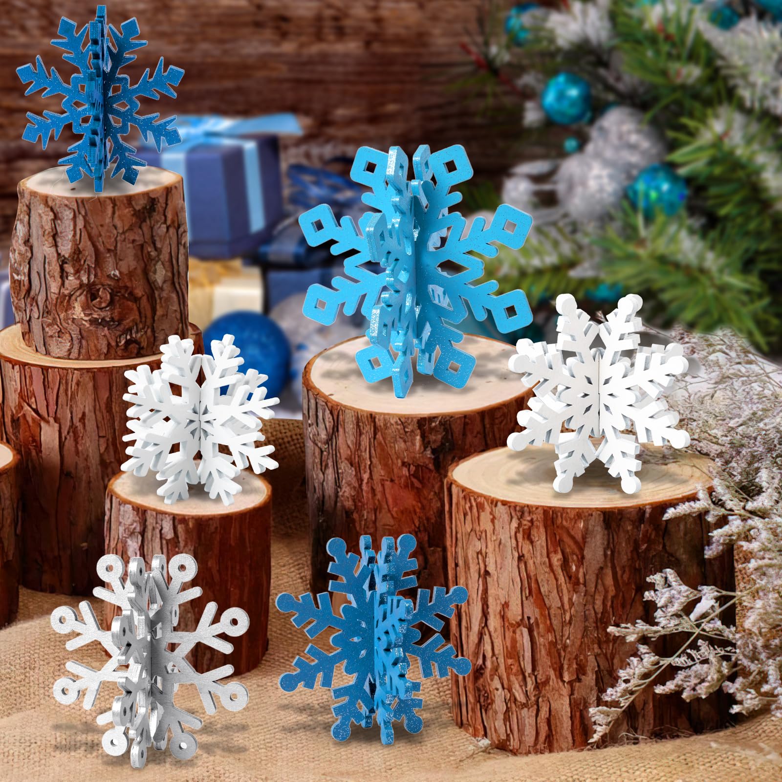 Elegant Snowflake Centerpieces: Turn your holiday table into a festive winter wonderland with our white and blue snowflake decorations. Including 18pcs white wooden snowflakes and 18pcs blue wooden snowflakes in 5 distinct styles and 3 sizes—3.9", 4.7", and 5.5" in diameter—these 3D snowflake table centerpieces are simple to assemble into 18 stunning sets
