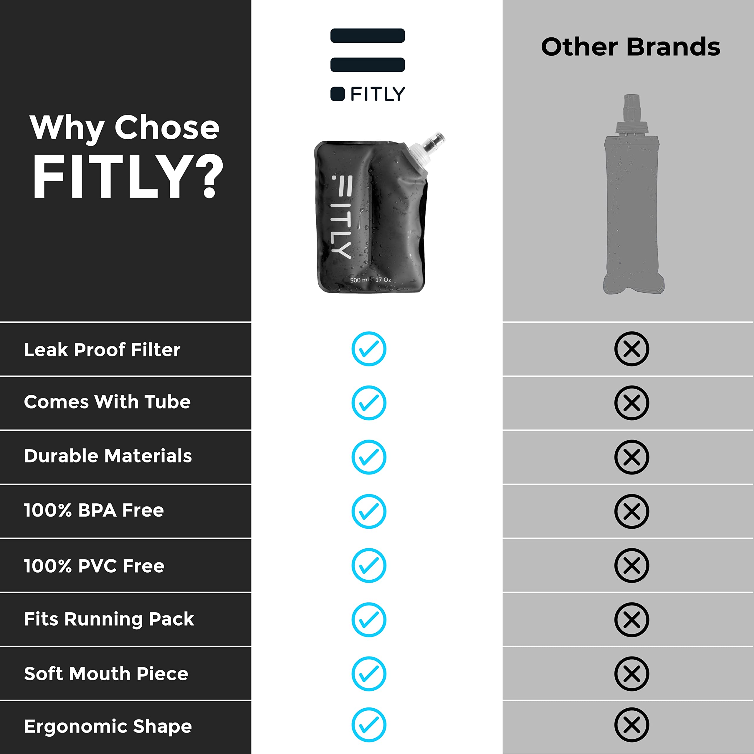 STAY LIGHT ON YOUR FEET: FITLYβs collapsible flask is purposely lightweight ensuring your light on your feet and not weighted down by unnecessary bulk. At FITLY, reusability is deeply important to us, and our water bladder is no exception. Enjoy limitless use from our portable soft water bottle for running vest that is 100% BPA & PVC-free.