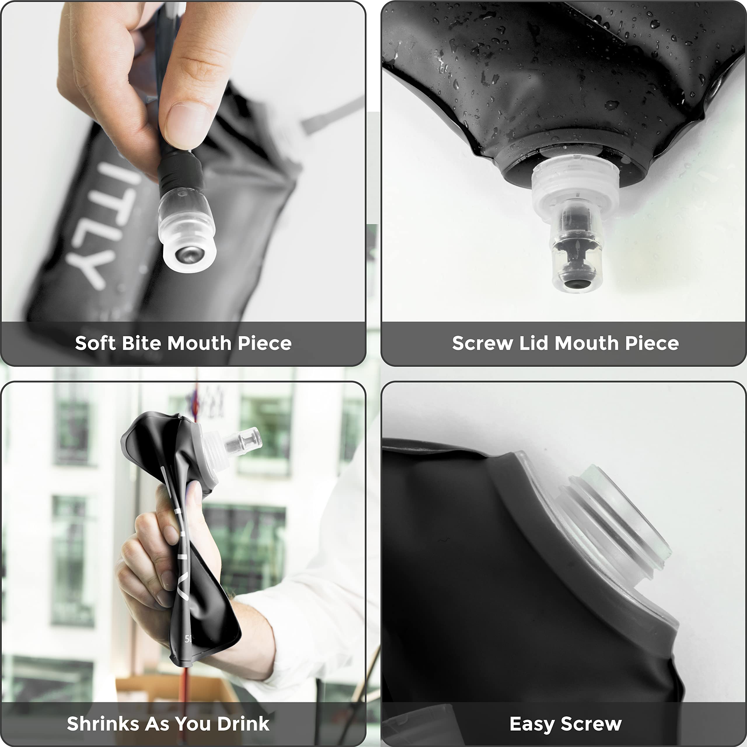 SHRINKS AS YOU DRINK: Our running vest water bottle is uniquely designed to shrink as you drink. This ensures the water doesnβt slosh around, bounce or rattle. The flexible design of our hydration flask shapes to your hand & body, meaning the soft flask is never unwieldy. Our flexible running flask features an intelligent bite valve & leak-resistant mouthpiece.