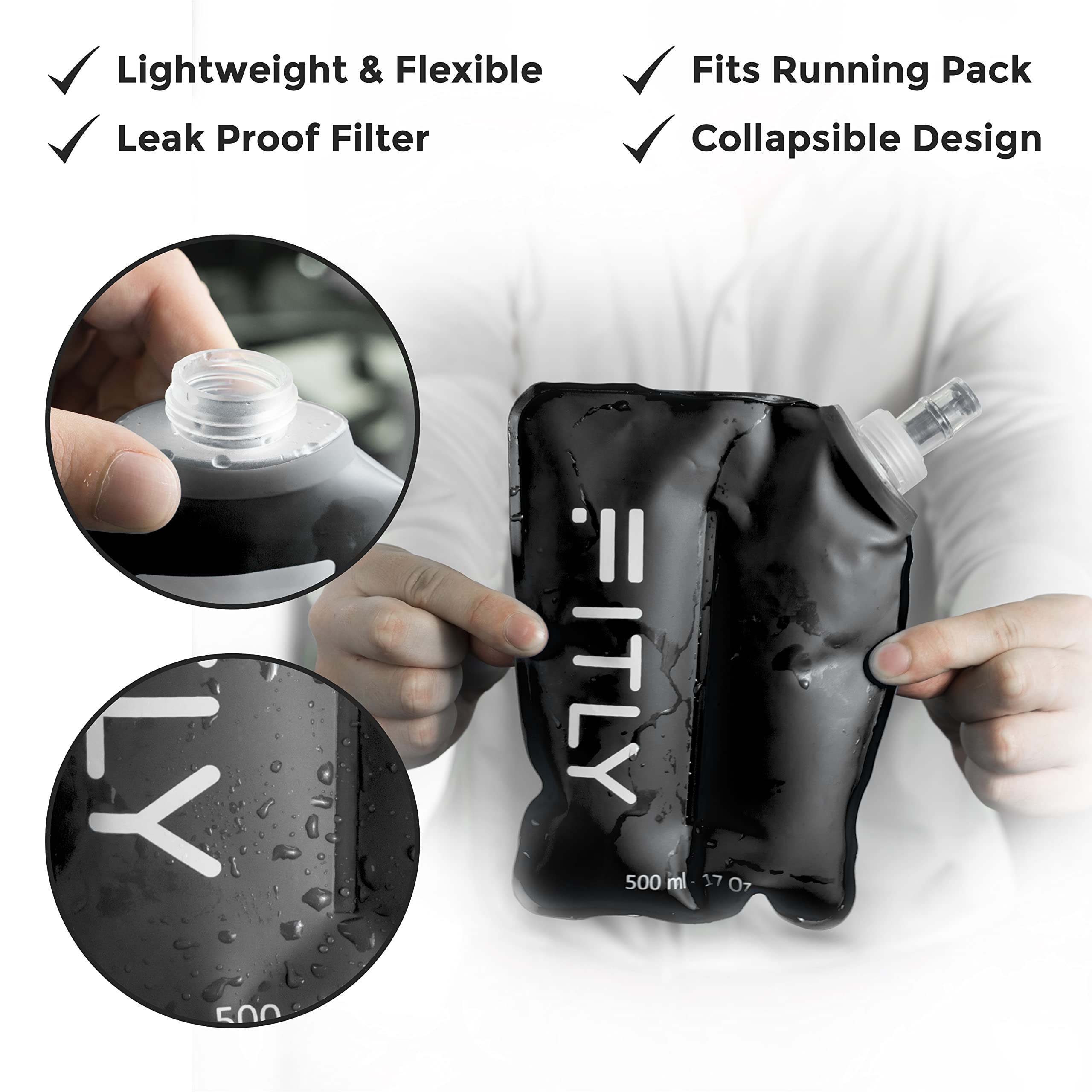 HYDRATION ON THE MOVE: Our large collapsible running soft flask is a compact and eco-friendly way to stay hydrated on the move! The soft water bottle is the perfect hydration tool for active individuals. Our soft water bottles for runners shrink as you drink, taking up minimal space and wonβt slosh around, making it perfect for running, hiking, skiing or any rigorous activity. The FITLY soft flask features a handy23 in (58 cm) long tube and silicone mouthpiece for easy access to hydration.