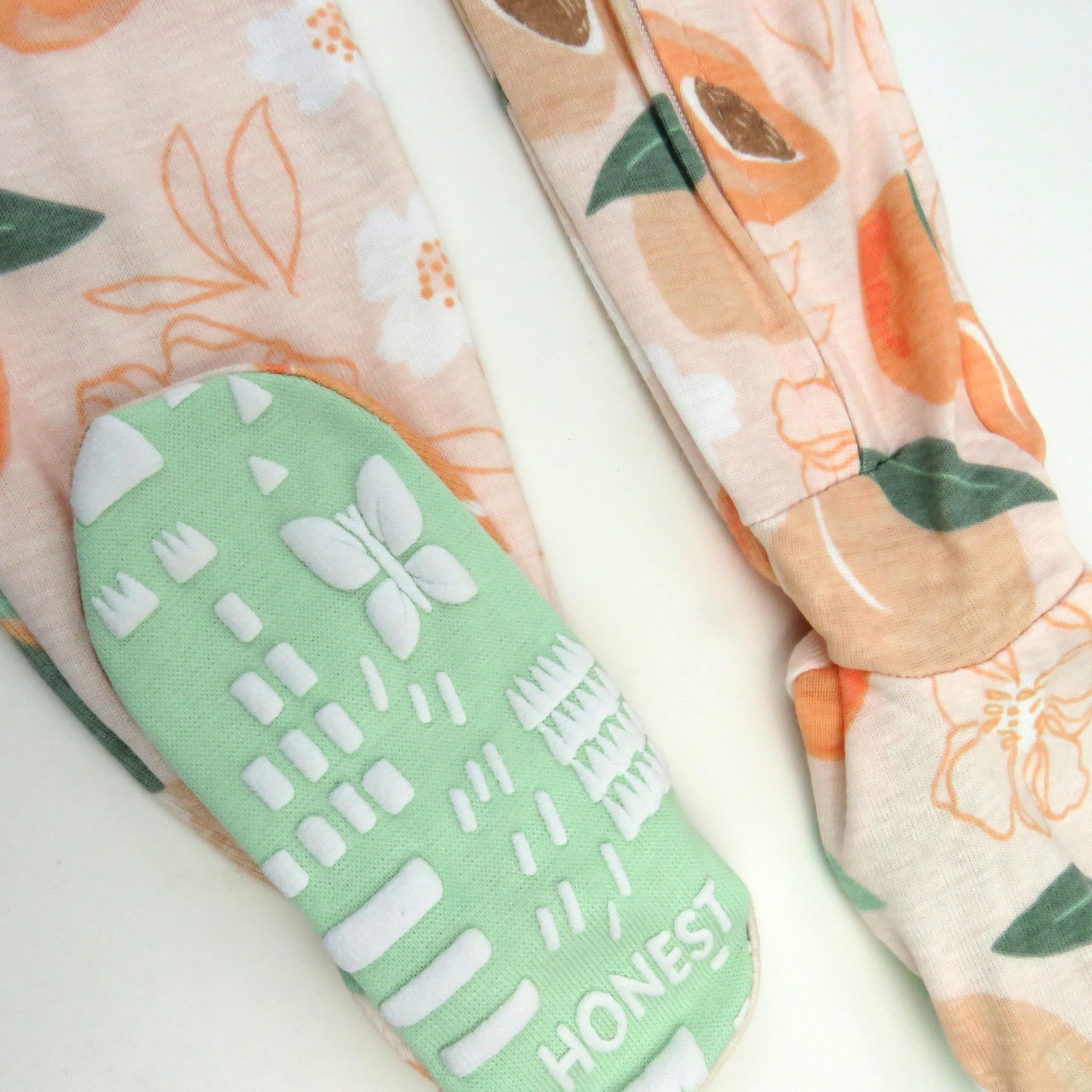 Description These snug-fit footed pajamas are designed to keep little toes cozy with elastic around the ankle to keep feet in place all night long. Friendly features include a full-open zipper with a tab to protect little chins, and foot grippers in fun Honest prints for early walkers. Soft and cozy 100% organic cotton makes this the perfect one-piece for sleeping, playing, and everything that happens in between.