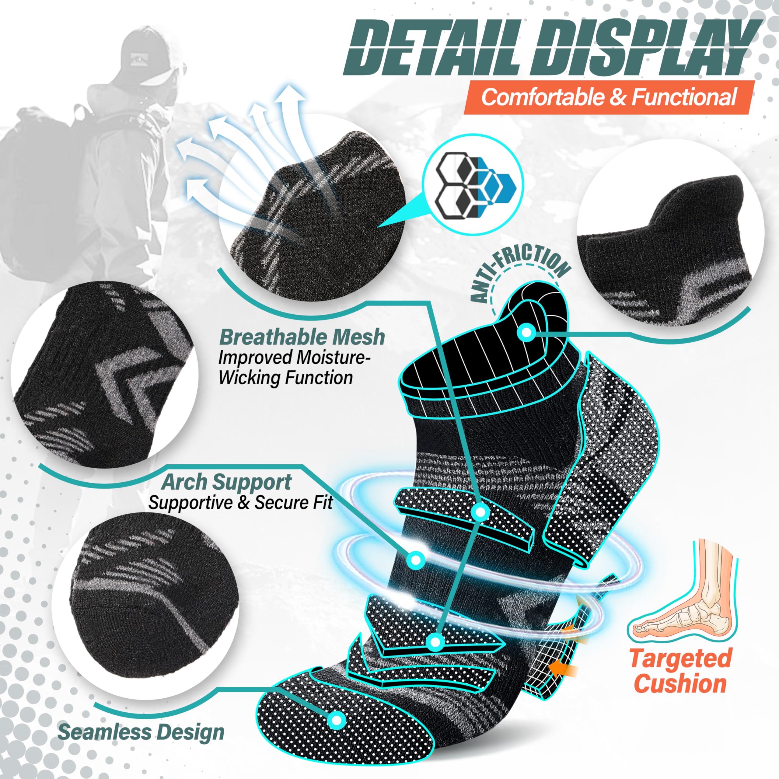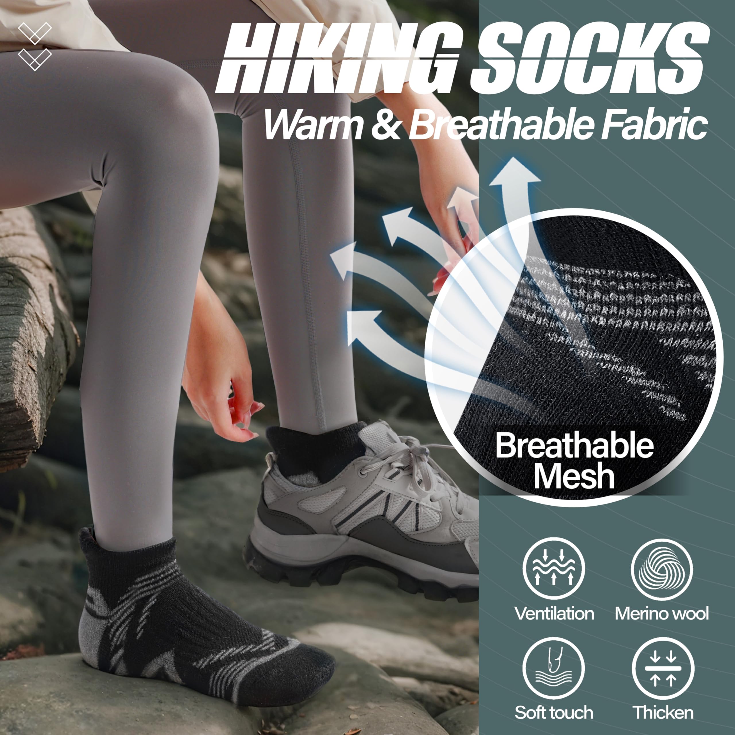 MOISTURE-WICKING DESIGN: Made of 70% MERINO WOOL, 23% POLYESTER, 5% SPANDEX , 2% NYLON.The material of these wool hiking ankle socks are wear-resistant , durable , and temperature regulation.These thick athletic socks for men and women feature excellent moisture control function, keeping your feet dry and breathable at all times , helping eliminate odor and preventing your feet from stinking.