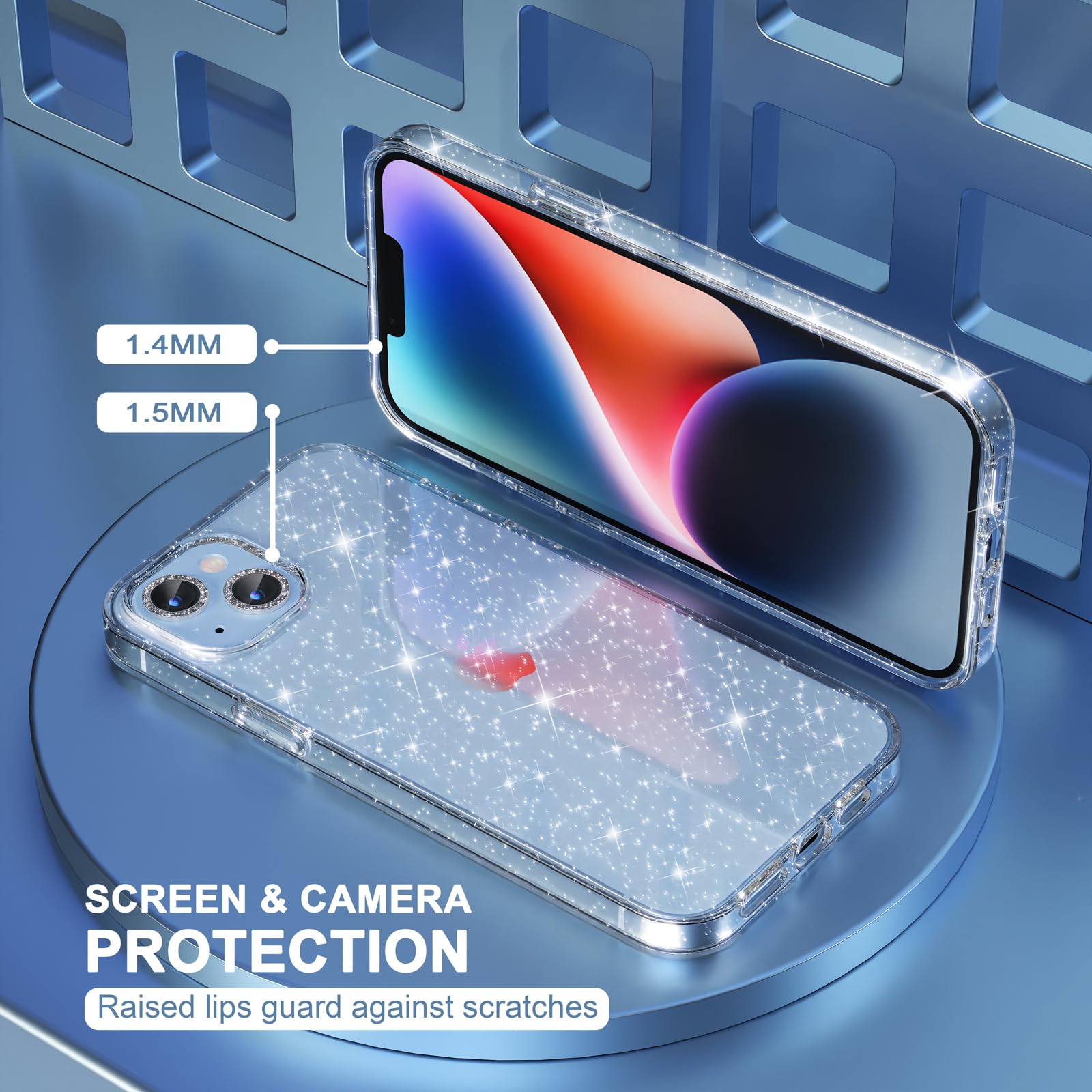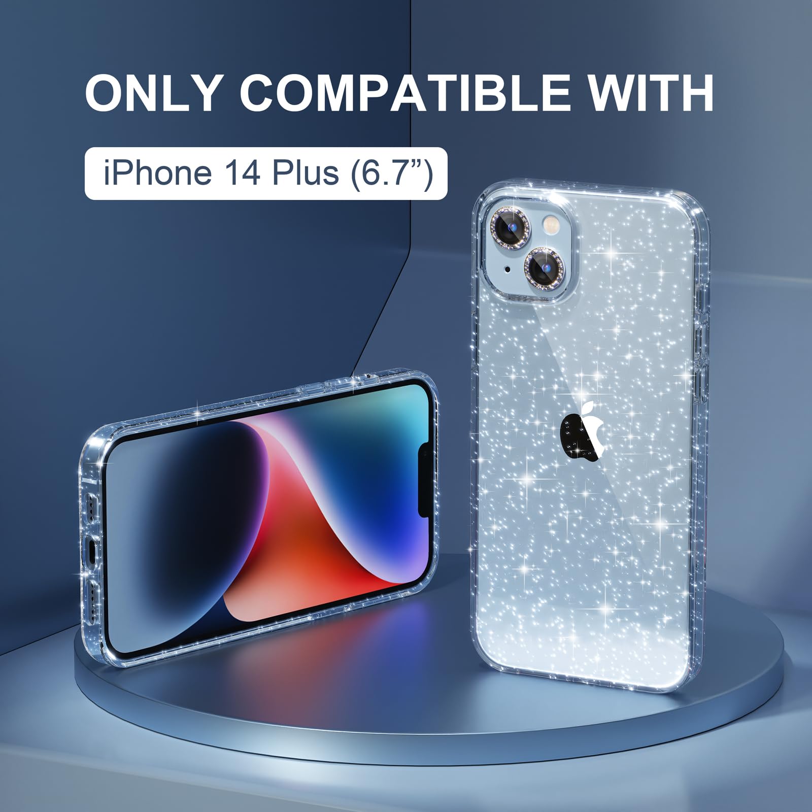 Package Includes: 1 x iPhone 14 Plus Glitter Case, 2 x tempered glass screen protectors, and 2 x Camera Lens Protectors. Compatible for iPhone 14 Plus 6.7-inch 2022. Please check your phone model and make sure you order the right size