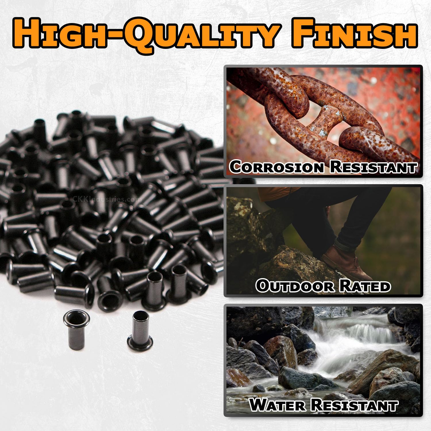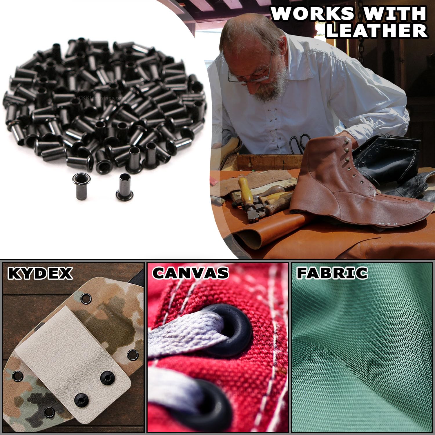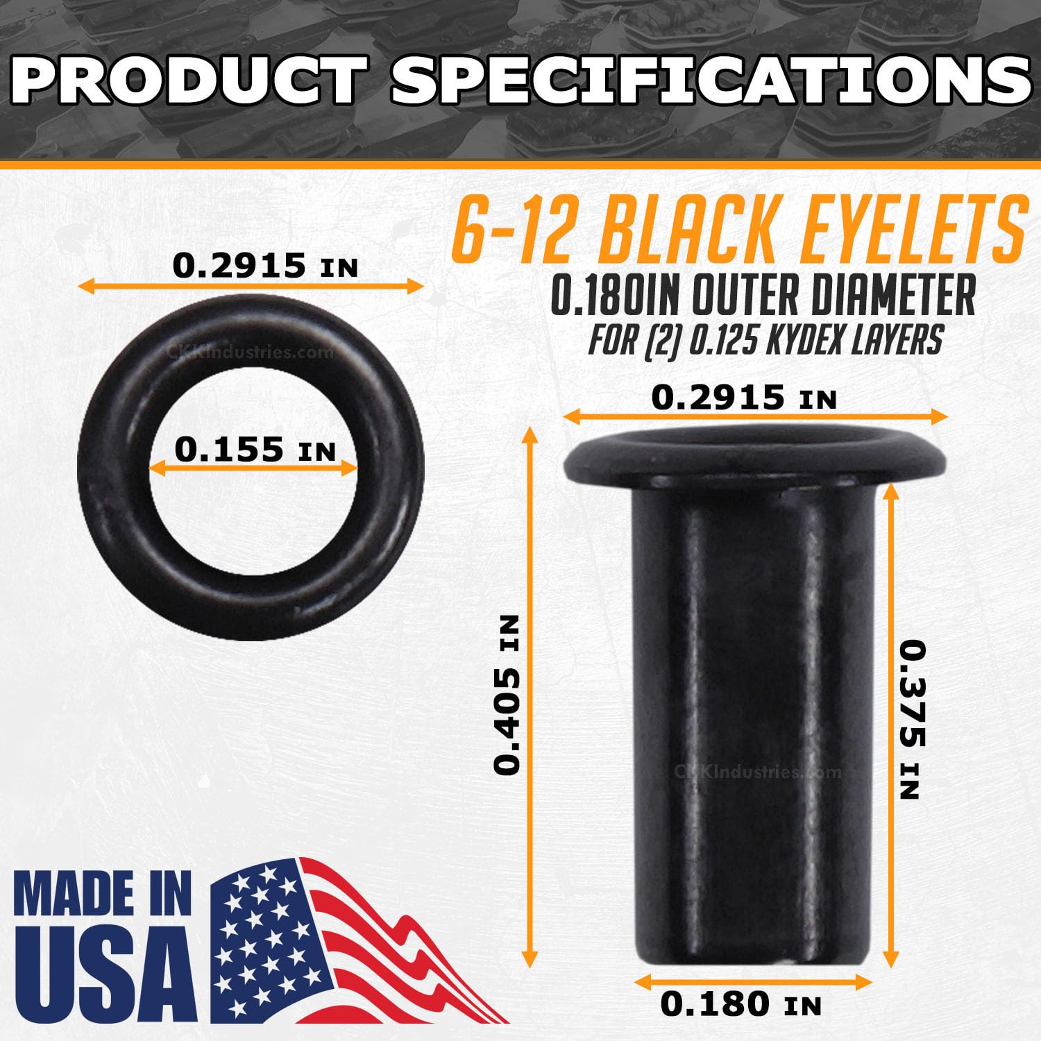 Color/Finish: Black | (#1 Best coating finish in the industry!) | These are the industry standard eyelets (sometimes called binding rivets) that are used in DIY thermoform holster and knife sheath making. They are also commonly used in making leather knife sheaths and gun holsters, and can be used in upholstery and garment manufacturing as well.