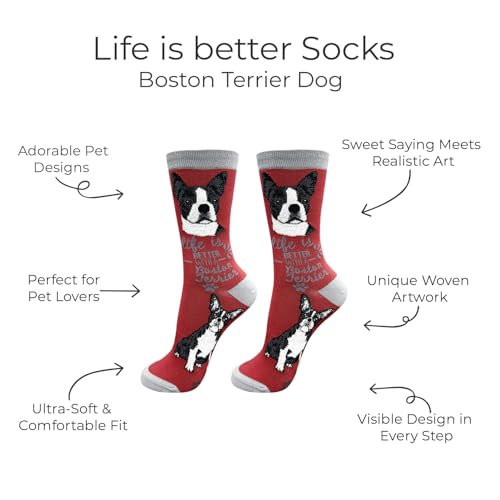 Description Introducing our collection of adorable and vibrant pet lover socks designed exclusively for pet lovers! These funny socks are the epitome of cuteness and novelty, guaranteed to bring a smile to your face. Big image of dog head woven on both sides on the socks and full body image woven on the bottom of the socks with a cute saying that says life is better with Dog. These socks are made in South Korea, These funny socks are made from 200 needle count machines which give life-like detail of your favorite pet. Step up your sock game with our adorable and hilarious Dog Socks, designed especially for pet lovers! These novelty socks are the perfect addition to your collection, featuring cute and silly designs that are bound to make you smile. Made with high-quality materials, these fun socks offer both comfort and style. They add a playful and fashionable touch to your everyday outfits, whether you're dressing up or keeping it casual. Whether you're a dog mom, a dog dad, or simply a dog lover, these socks are a must-have. With their delightful designs and comfortable fit, these socks are a fashionable treat for pet lovers and make great novelty gifts and dog mom gifts.