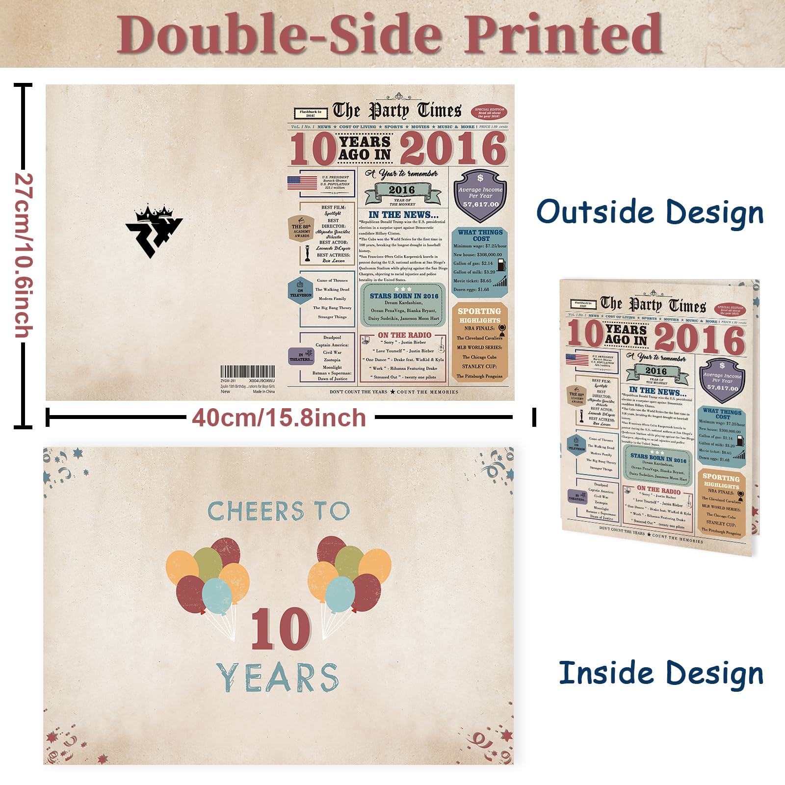 Celebrate your loved one's 10th birthday with this oversized, high-quality greeting card from Zyulin. Measuring 10.6 x 7.9 inches, this retro-style card features a funny theme and letter print pattern, perfect for boys or girls. Express your love and memories in the blank section, making the birthday boy or girl feel truly special. Printed on smooth, heavy cardboard, this card is sure to stand out and make a lasting impression.