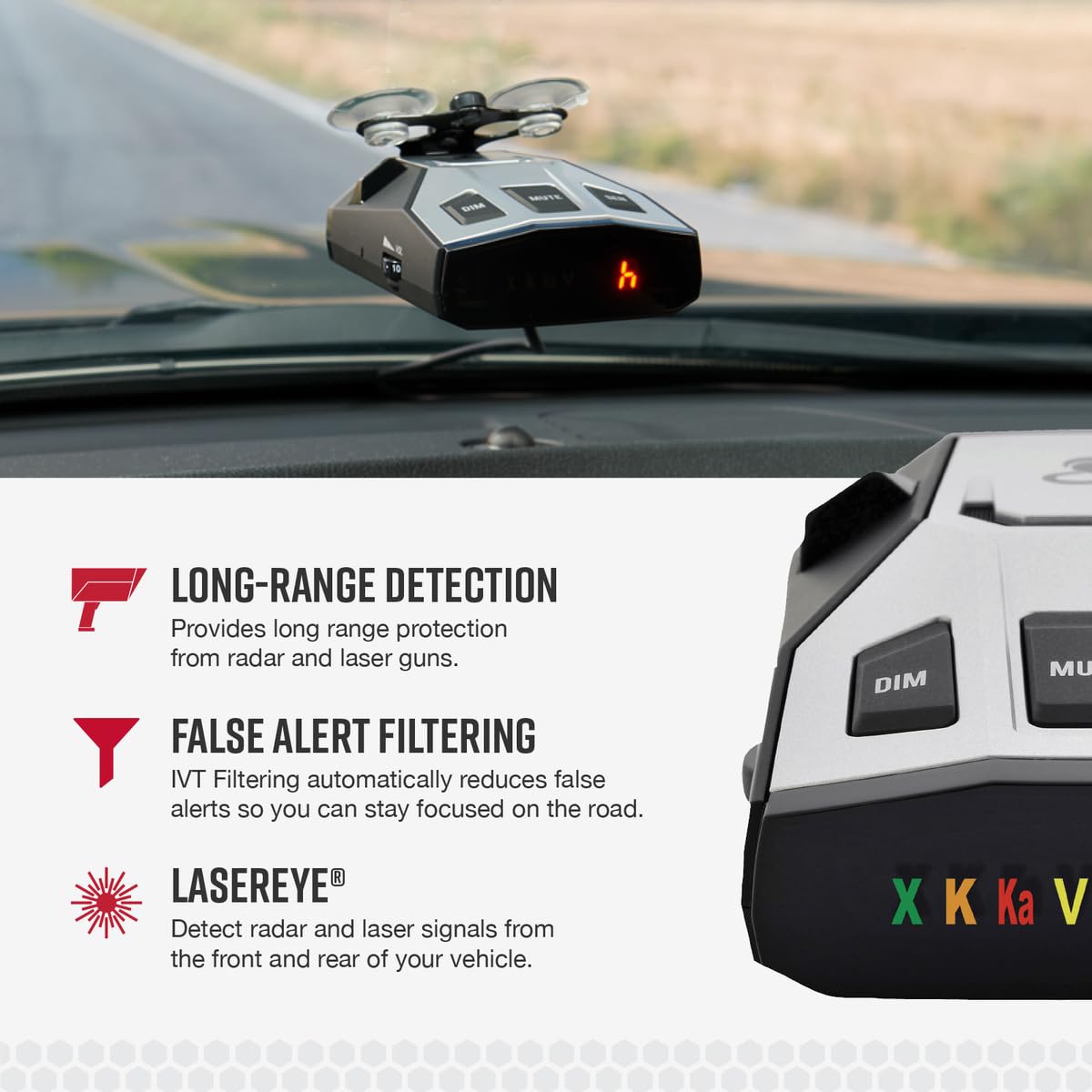 Audible Signal Strength Levels: Unique tones provide signal strength and band identification so you can keep your eyes on the road and still identify what type of alert is detected.