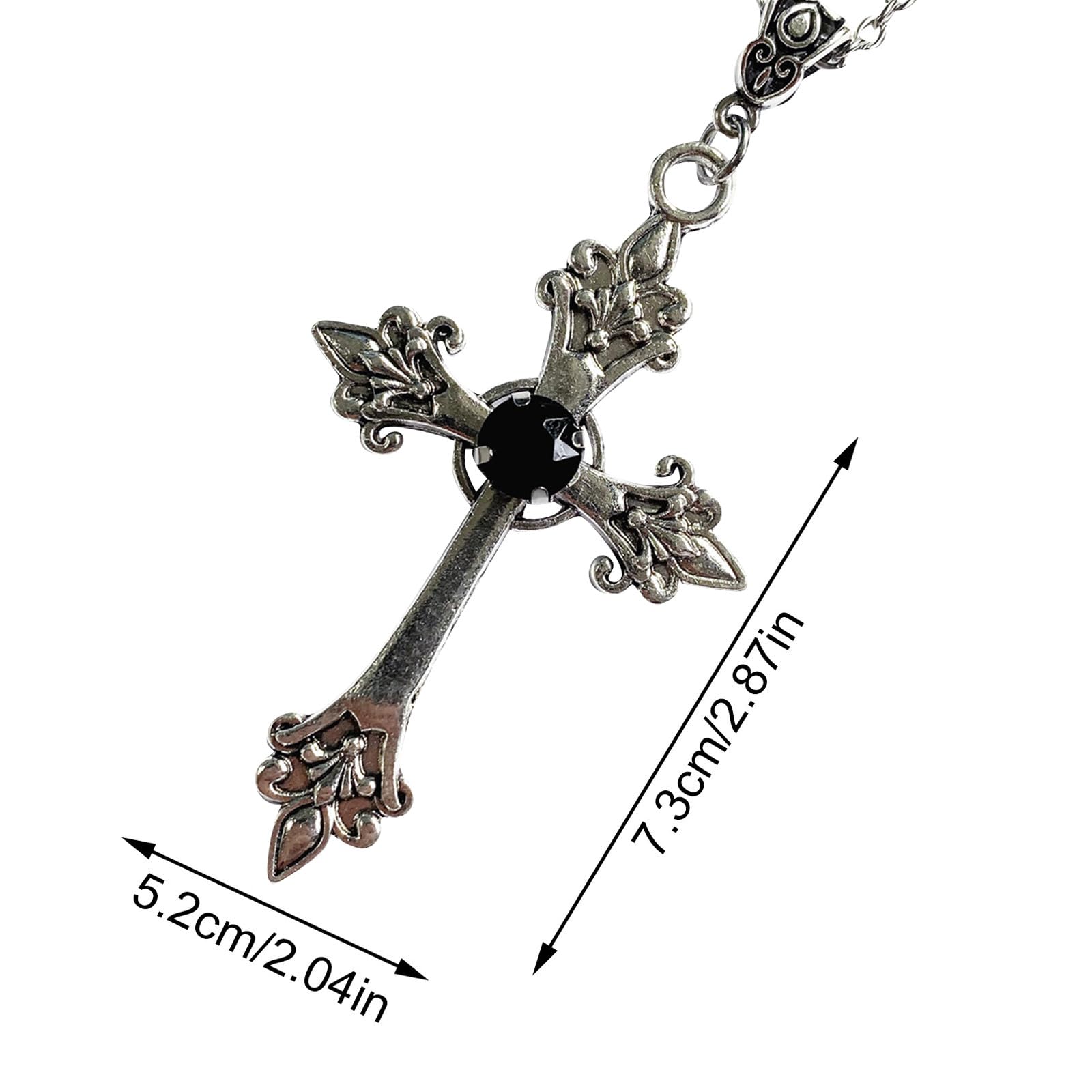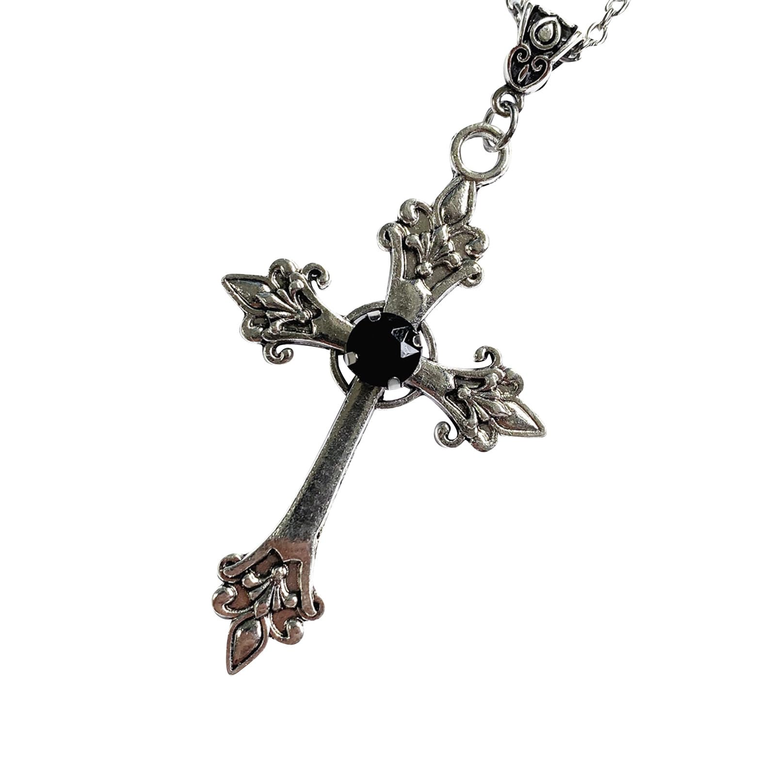Silvertone pendant of a large, ornate cross on bail loop, with black glass stone center. hangs off of a matching chain.