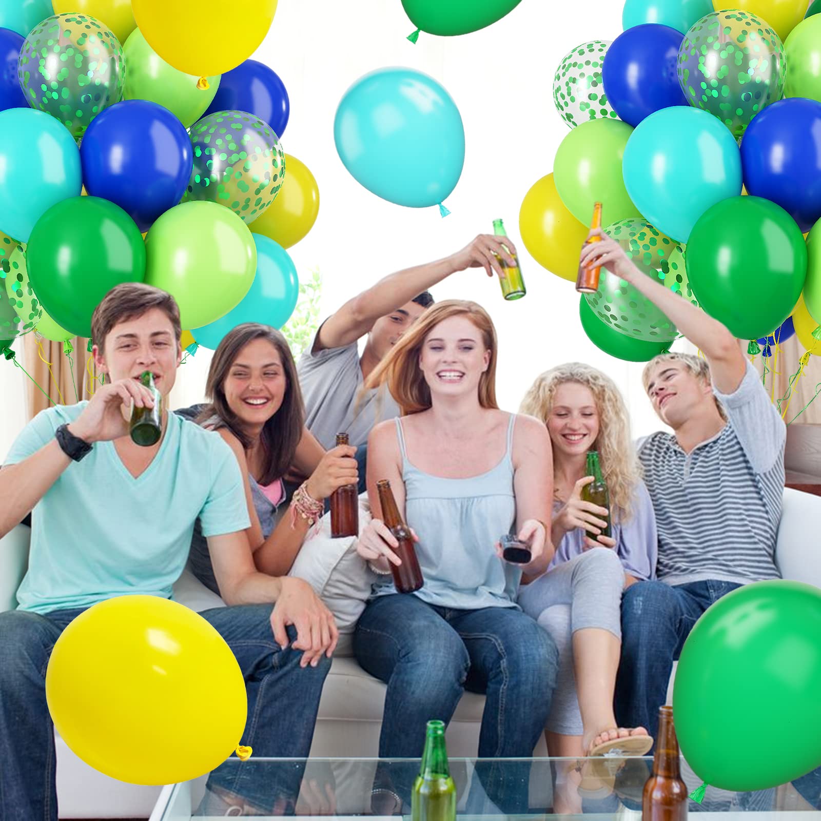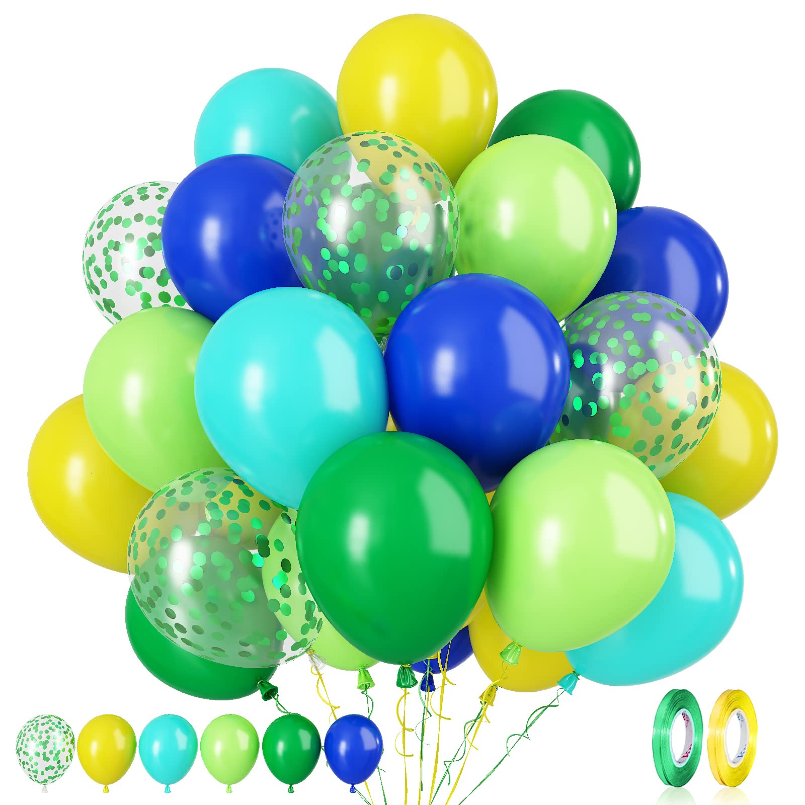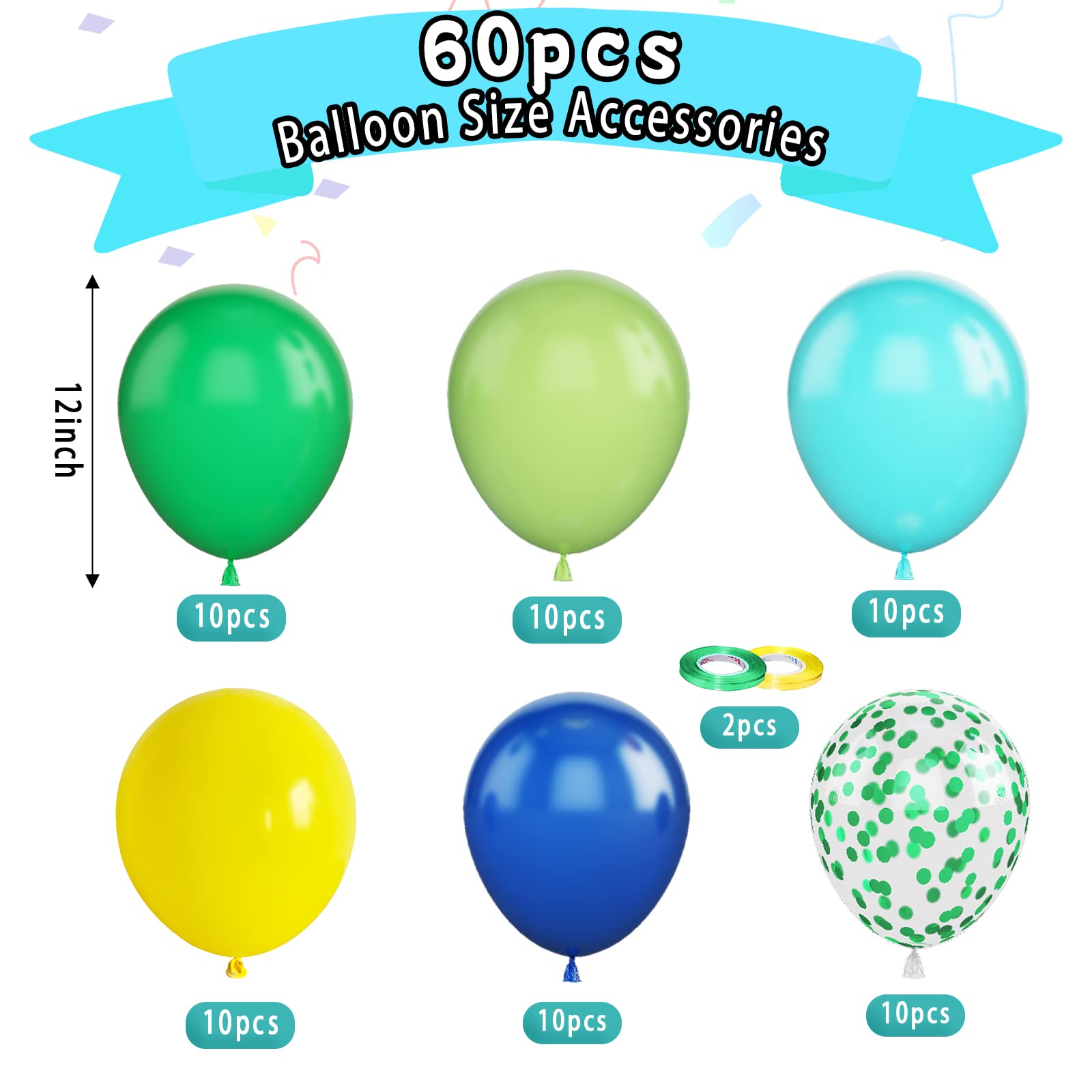 Mixed Balloons Set: The 12 inch green and blue balloons set includes 10pcs light green balloons, 10pcs dark green balloons, 10pcs yellow balloons, 10pcs vintage blue balloons, 10pcs teal blue balloons, 10pcs green confetti balloons, 2 roll of ribbon. 62pcs in total. A variety of green and blue latex balloons set is suitable for your beautiful art theme decoration.