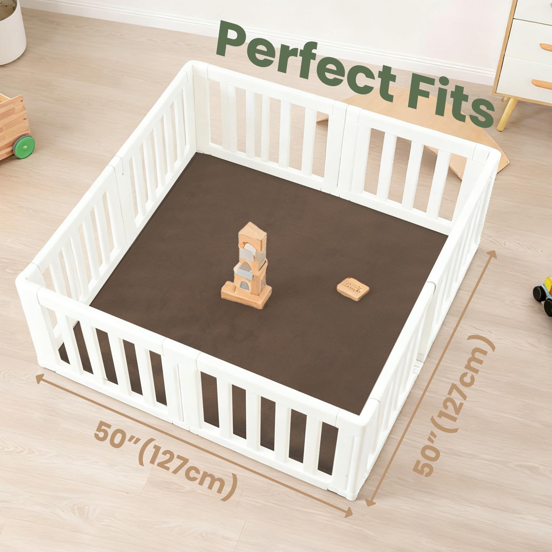 Non-Slip Backing for Secure Play:Engineered with a non-slip rubber base, this playpen mat stays firmly in place on hardwood, tile, or carpet, preventing slips and ensuring a safe environment for crawling babies and active kids.