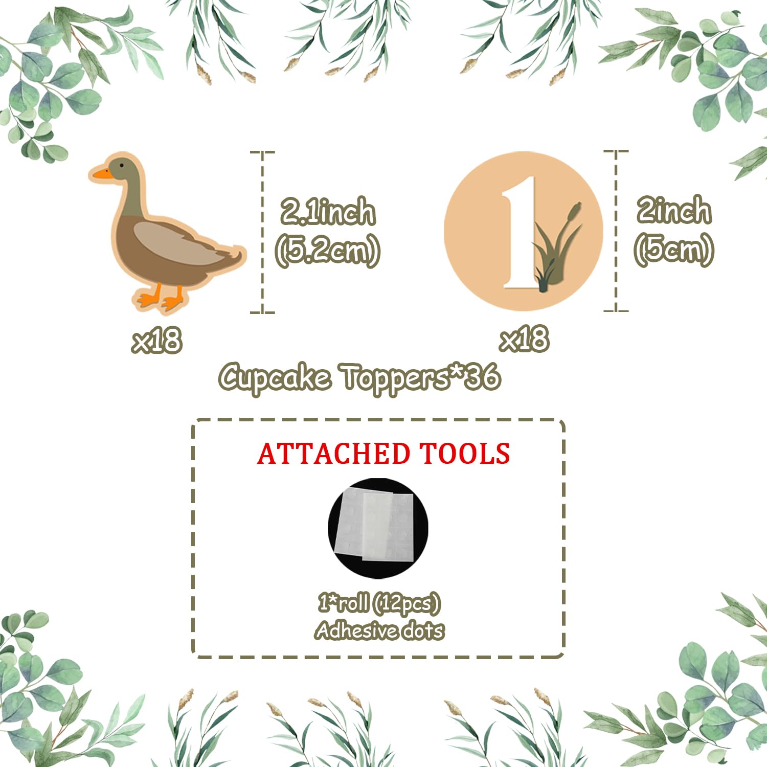 Package List: The kit includes everything you need, such as 6*Mallard Duck Cupcake Toppers(2.1inch), 6*1 Cupcake Toppers(2inch) and some assembly tools.
