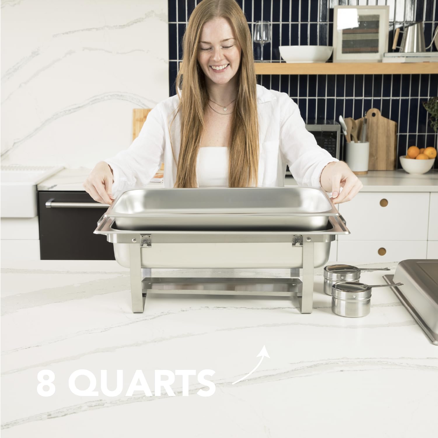 STRONG MATERIAL - Alpha living’s chafing dish has a Stainless Steel, frame As well as a heavy duty handle that supports its 8 quart tray.