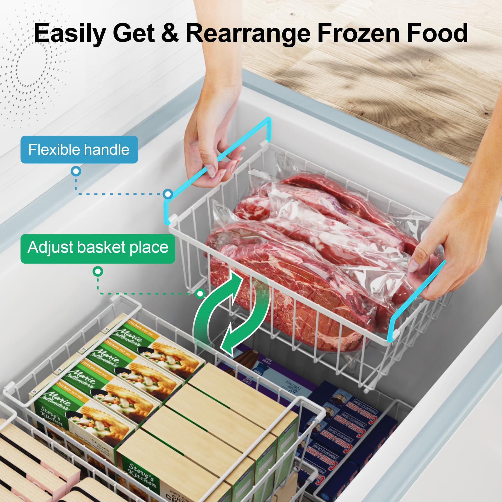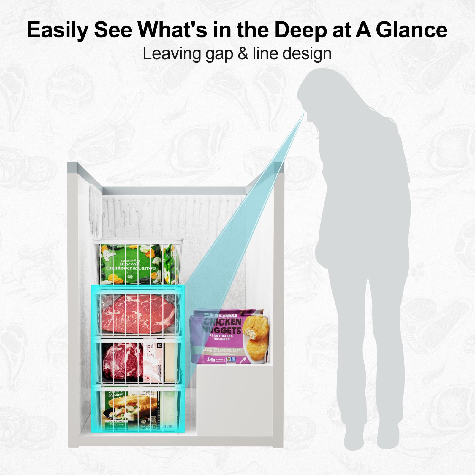 [Hold Heavier Food Not Deformed] The wireline of the freezer baskets for chest freezer is 20% thicker than the freezer baskets on the market, can hold more heavy meats up to 33 lbs; also you can see what's in the bins at a glance, even the bottom bins, save you time to find food