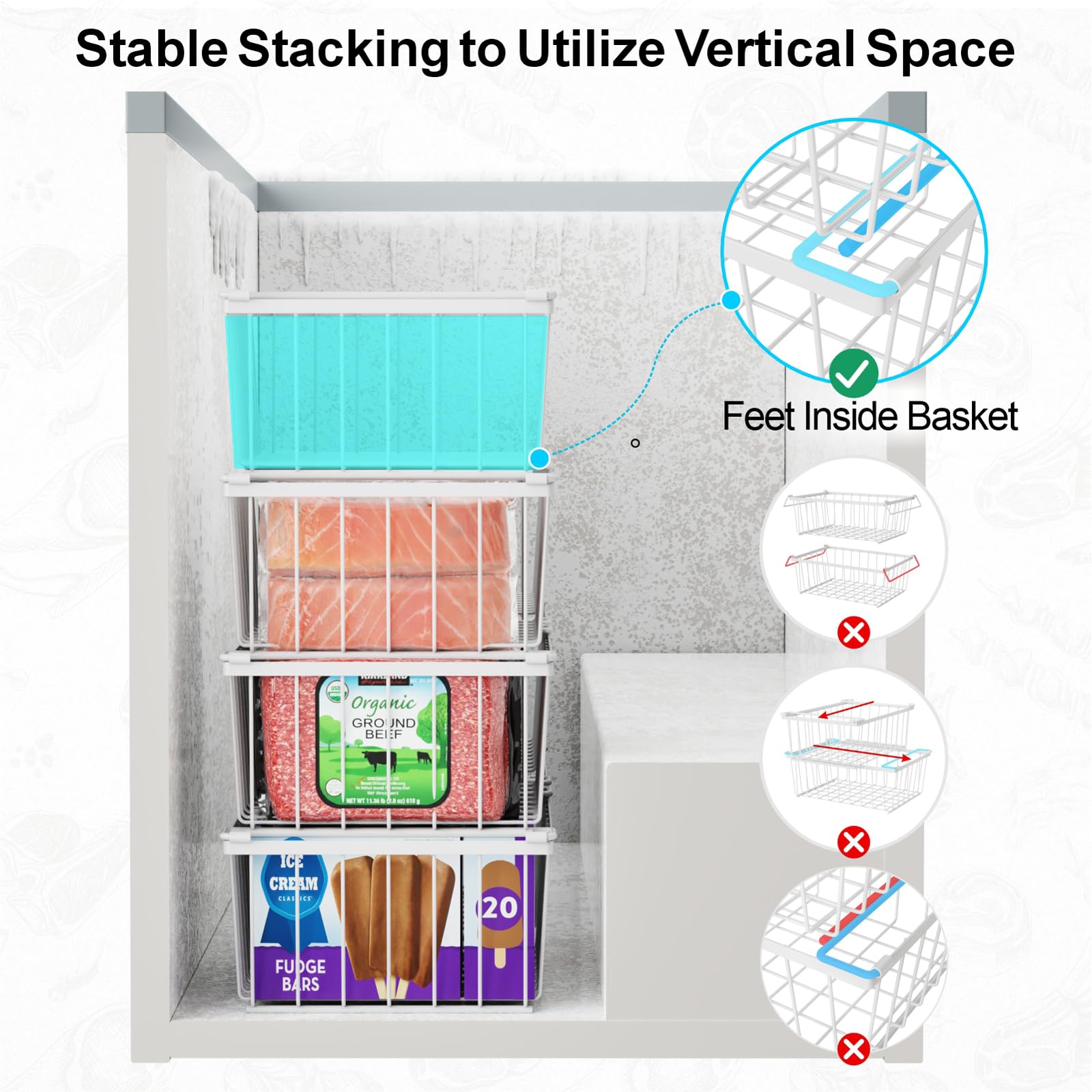 [Easy to Get & Rearrange] Fold down the handles to stack them on top of each other to use the space efficiently; Easy to get food as well as pull them out by basket rather than individually to get something at the bottom, when organizing the small freezer, rearrange the freezer bins without having to rearrange each food package