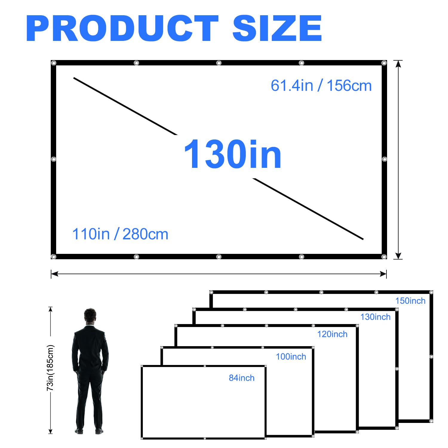 【Projector Movie Screen Fabric 100%】 Crafted from natural polyester fabric, our 130 inch projection screen offers sharper and brighter visuals compared to many others on the market. Thicker and smoother, it supports 3D and HD movies with high color reflection. Available in a 16:9 format, projector screen it's for both living rooms and backyards. Each package includes 1 projector screen, 2 cords, and hooks for easy setup.