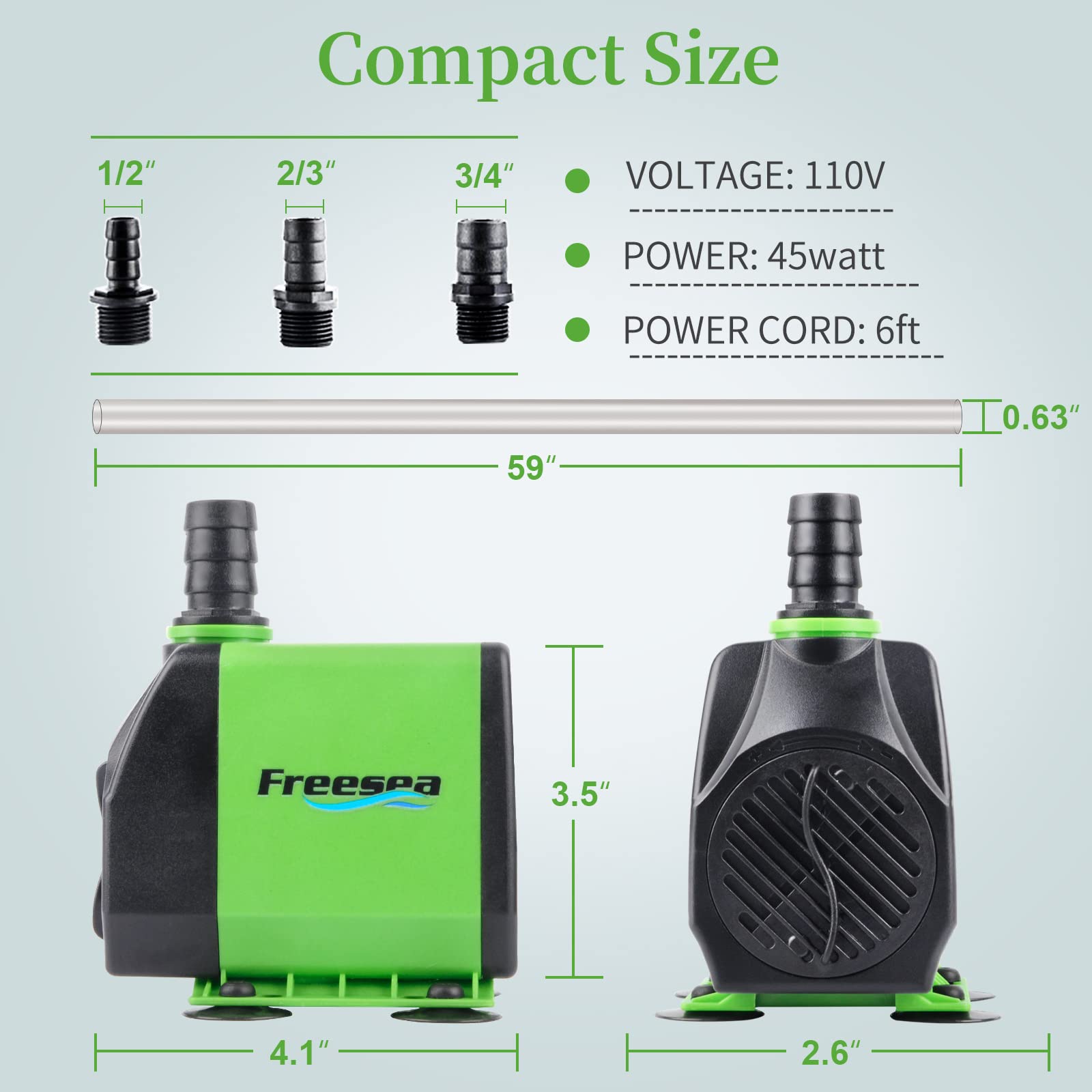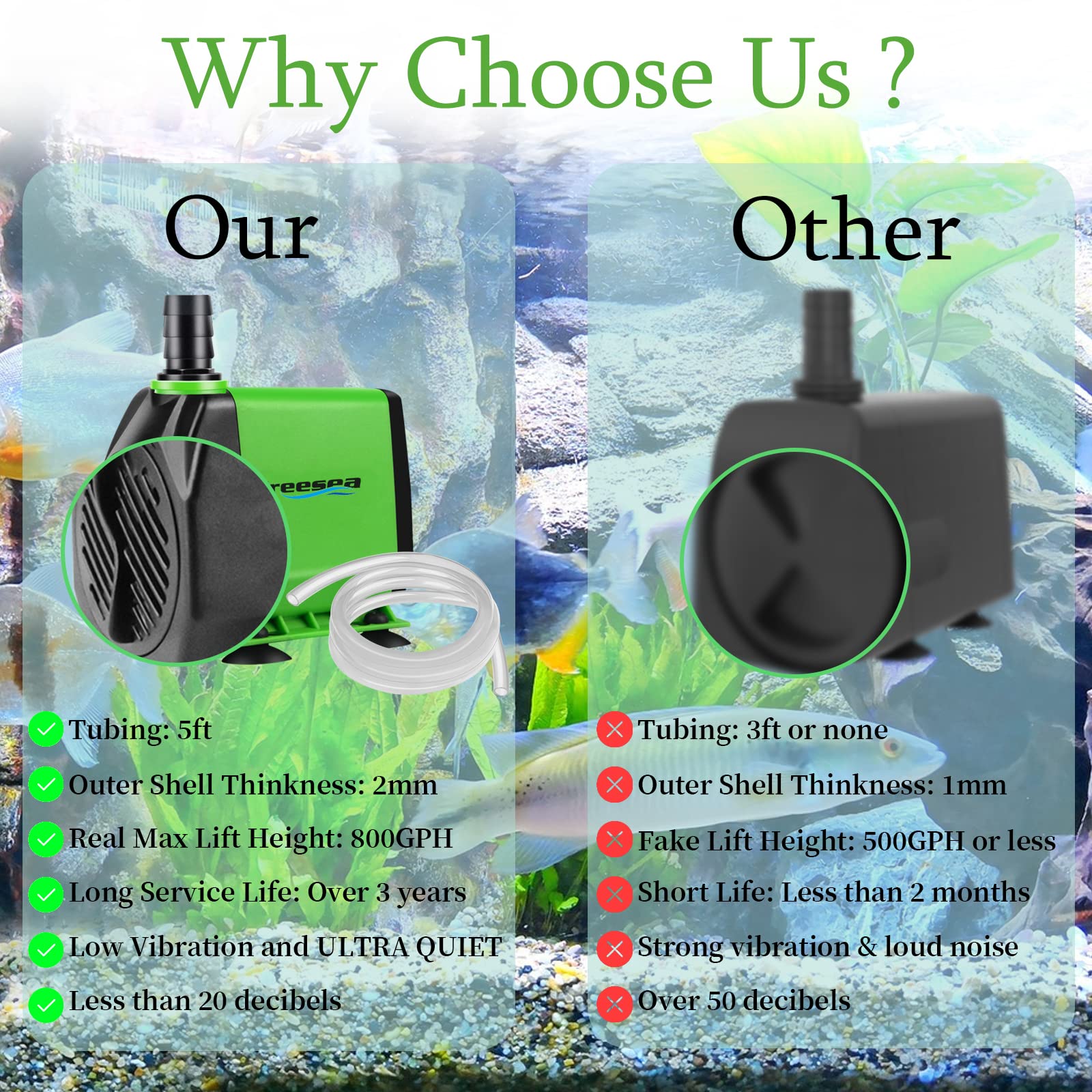 800GPH with tubing: The submersible pump comes with 5ft tubing for more applications. It works steadily for over 25,000 hours due to 45W high-performance motor. And the mini pump for fountain uses an upgraded ultra-rugged outer shell for long service life