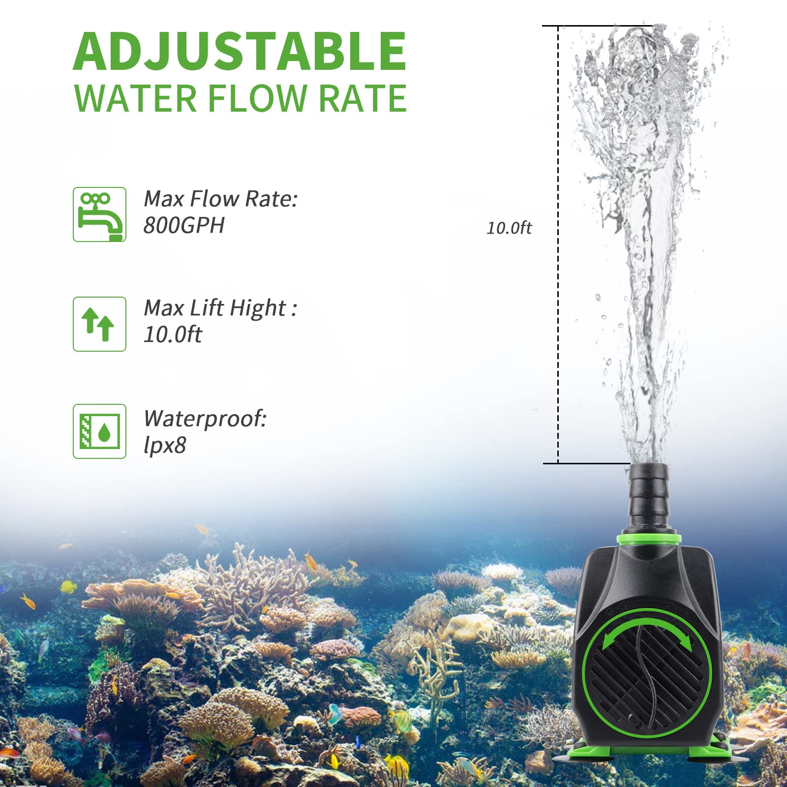 Adjustable Flow Rate: The fountain pump is designed with an adjusting knob, allowing to get the amount of water pressure you want. The maximal flow rate can be up to 800GPH. The waterfall pump can continually elevate column of water up to 10ft