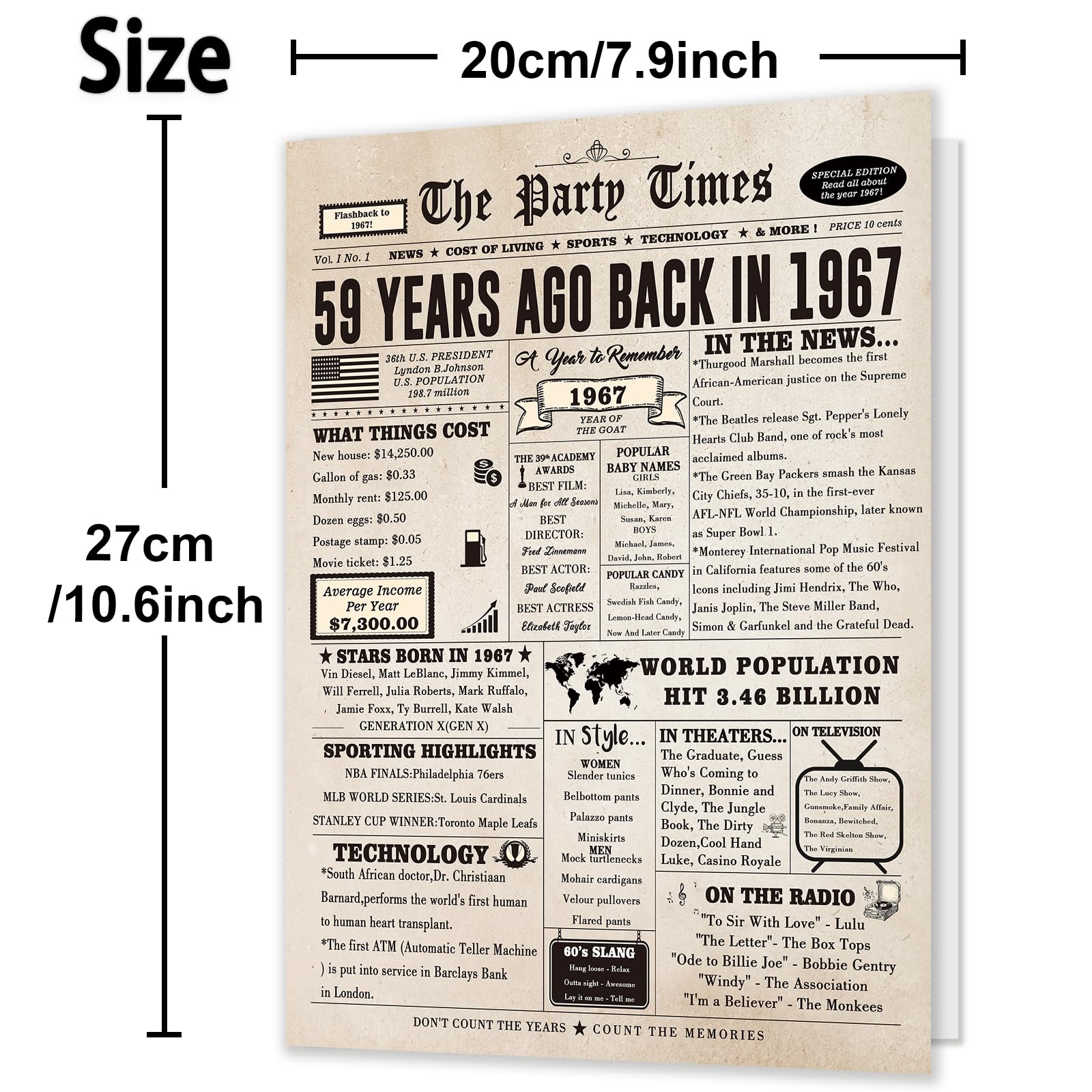 In a world where every year is a chapter in the story of life, It's more than just a card; it's a cherished keepsake and a testament to the joy of celebrating life's milestones! When it comes to celebrating a remarkable 59 years of life, 59th birthday card is the ultimate tribute to a journey well-lived. Whether you're celebrating your best friend, parents, siblings, or spouse, this card is the perfect gift that encapsulates a lifetime of memories. Perfect option to recognize a milestone birthday. Size is large enough to easily read all the interesting fun facts. Plenty of room inside to personalize, well wishes/messages. Great option when you want a little more than a typical birthday card. Funny card with lots of good facts about the year you choose eg: median house prices, incomes, gasoline, historical events, movies, ect many of the events depicted on the card. The size was great to pass around for all to read, and made it handy to insert my own text.